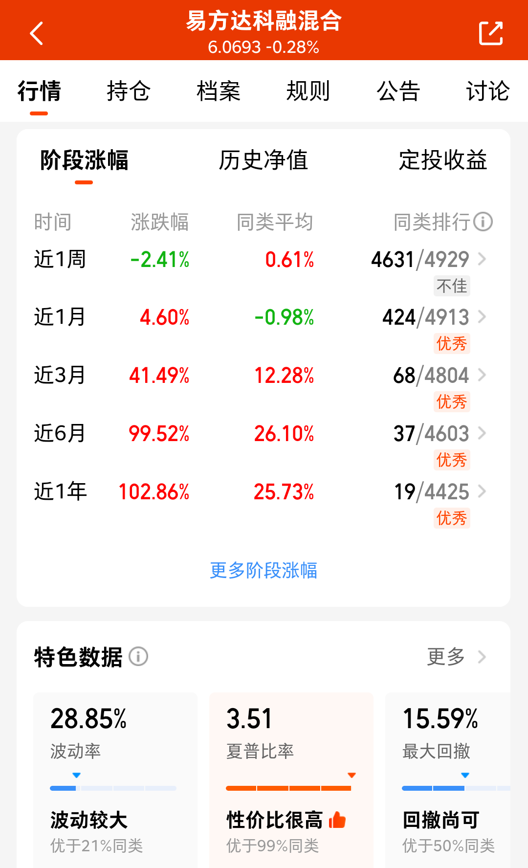 最近科技板块调整过后要开始反弹啦,但是科技板块细分多,相比单一赛道,还是均衡配置的更有优势,比如易方达科融混合,不仅买了科技,还买了反内卷相关的新能源相关的,深度参与科技、新能源、军工轮动配置,夏普比率优秀,可以说是成长里的均衡之选。