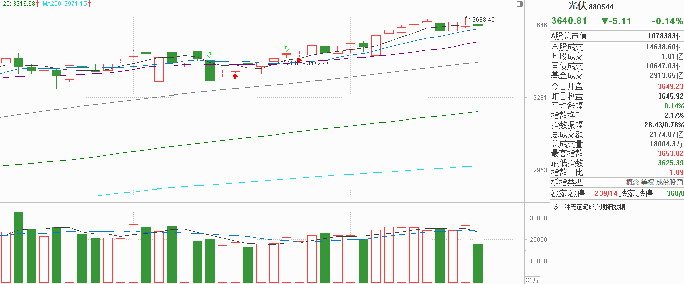 光伏的朋友们注意了!上周五低开高走创新高后回落,上影线比较长,说明有获利抛压出现。如果光伏是上涨趋势,这种上影线是没有必要理会的,因为短线筹码是最不稳定的,只要有新的高点出现,筹码很快就会自己锁定自己。今天光伏在5天线上方窄幅震荡,算不上是探底10天线回升,更明确了光伏近期的走强,这可能与微盘股风格占比较多导致的,是的,光伏近期的未知因素我认为是与微盘股风格相关的。看细分赛道,今天光伏产业、储能、风电都是回调,机器人虽然是上涨的,但权重是最弱的,通常不能对冲光伏产业的走弱,而光伏就在新高附近窄幅震荡,像极了微盘股的走势。我觉得当下光伏行业的走强是以大量小微盘风格为主,这个就很难捕捉机会了,只能是个别品种个别表现。不管怎样,光伏只要上升走势不变,轮动还会持续,不排除明天又到了储能或光伏产业轮动,中线走好潜力还在。