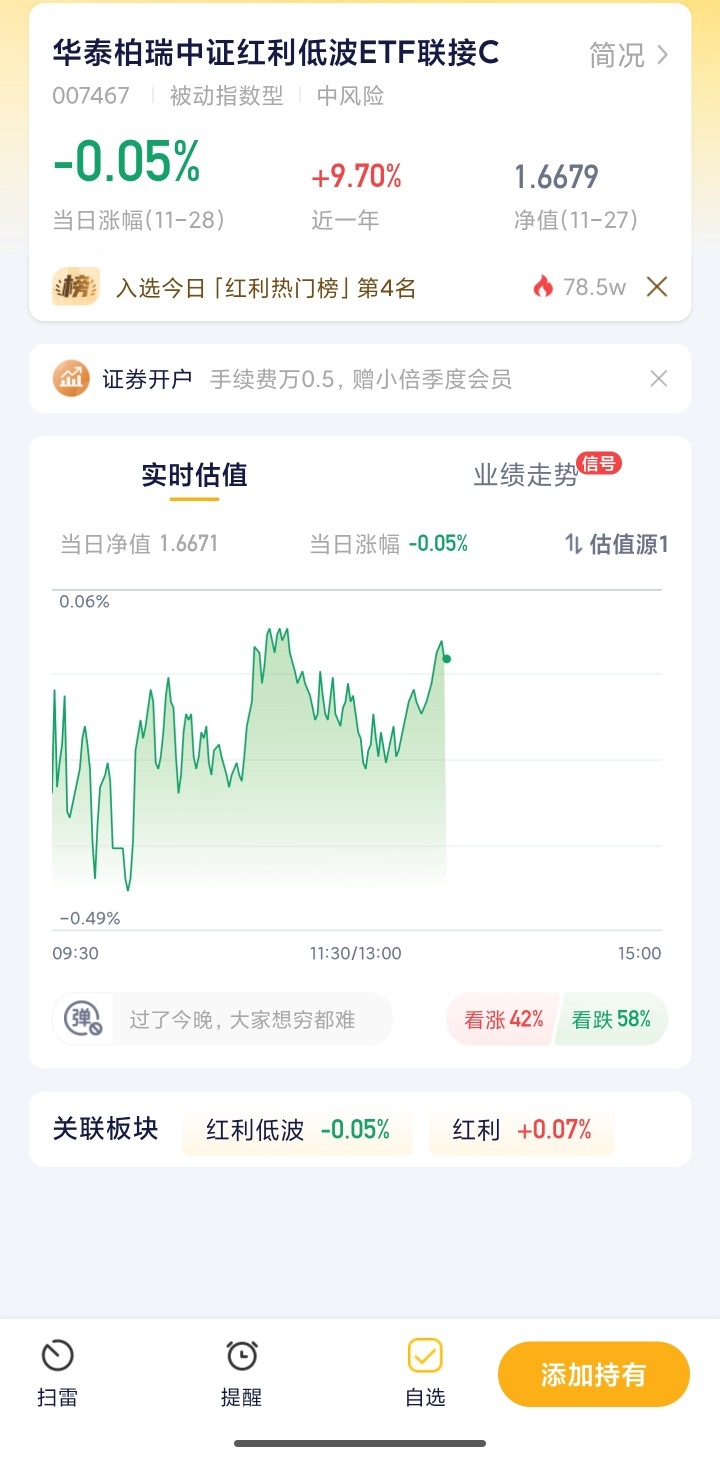 今天红利低波板块继续保持强势,看着它一路稳涨,总算明白为啥越来越多的人把它当成持仓“标配”了!现在市场环境复杂,想赚快钱太难,反而这种能稳定分红、波动又小的板块更靠谱,红利低波选的都是行业里的优质公司,业绩稳、分红多,今天这走势更是让“稳健收益”看得见、摸得着。华泰柏瑞在红利低波赛道布局得很早,它家的产品跟踪精准,能牢牢抓住板块上涨的机会,而且C类份额特别适合普通人,门槛低、操作灵,不用纠结长期持有,想用钱的时候随时能赎回。对于咱们普通人来说,投资不用追求高风险高收益,像这样跟着稳涨的板块,选个靠谱的产品,稳稳当当赚点钱,比啥都强。$华泰柏瑞中证红利低波ETF联接C$