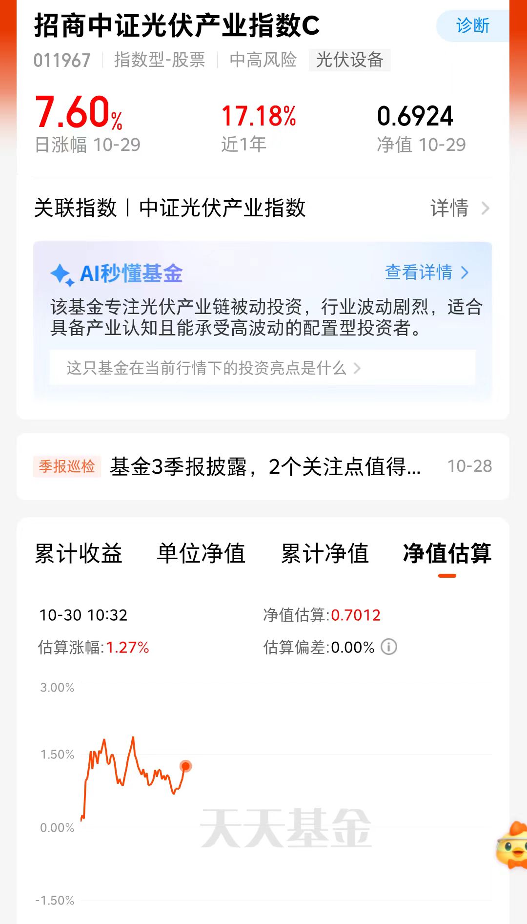 昨天沪指再创新高,今天盘中继续上涨,牛市行情就是牛。光伏板块昨天强势上涨,今天涨势还在继续呢,现在临近月底,从技术面上看是处于月线级别扭转下跌趋势,均线拐头向上;底部放量突破,趋势反转可以加仓布局,关注$招商中证光伏产业指数C(OTCFUND|011967)$,他覆盖光伏产业链,昨天大涨7.6%,实力强啊。