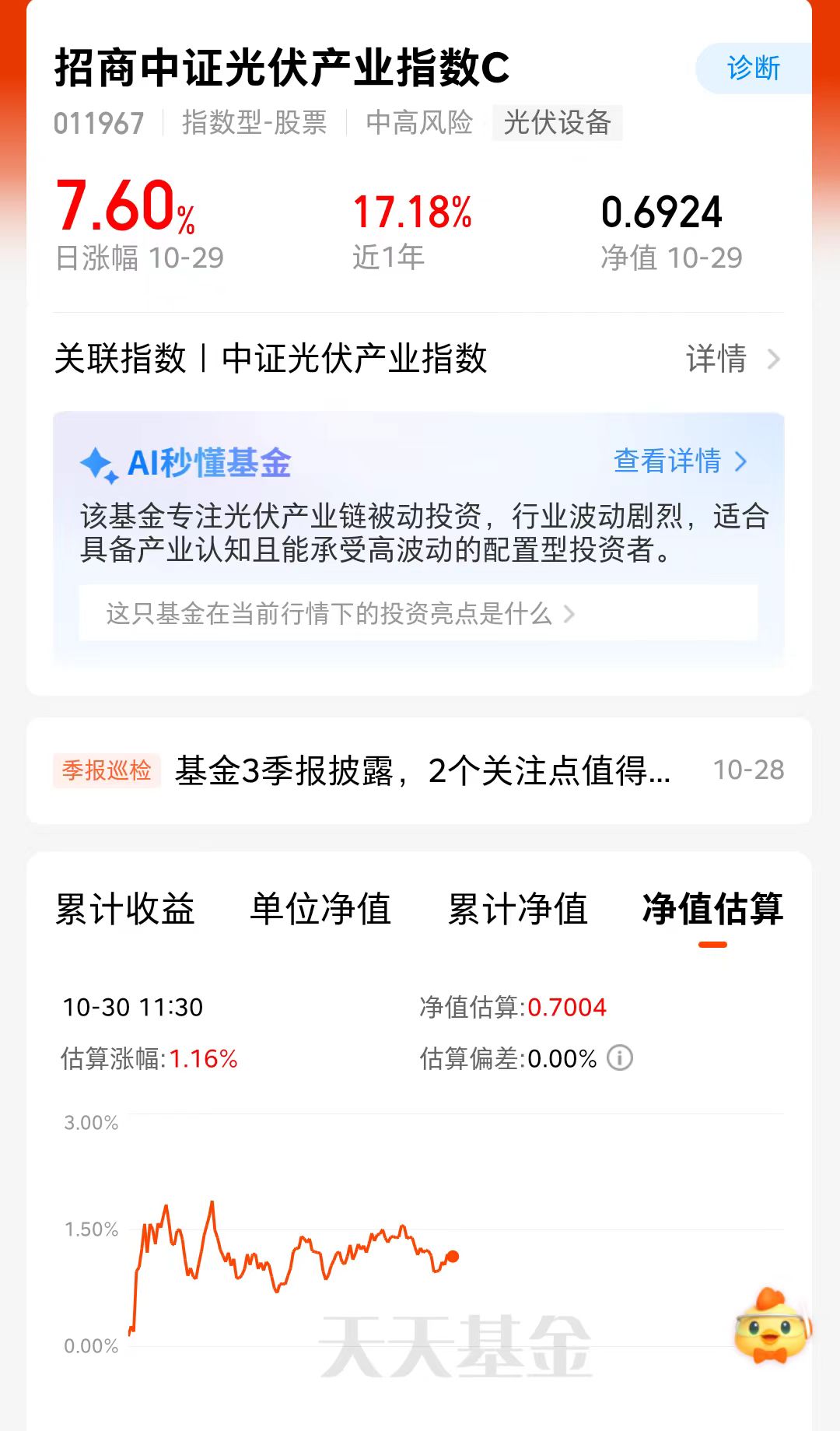 股市行情上涨,板块轮动分化,但是从技术面上分析,光伏板块月线级别扭转下跌趋势,均线拐头向上;底部放量突破,趋势反转,迎来上涨行情。$招商中证光伏产业指数C(OTCFUND|011967)$,昨天强势上涨7.6%,紧跟牛市行情近半年上涨54.97%。