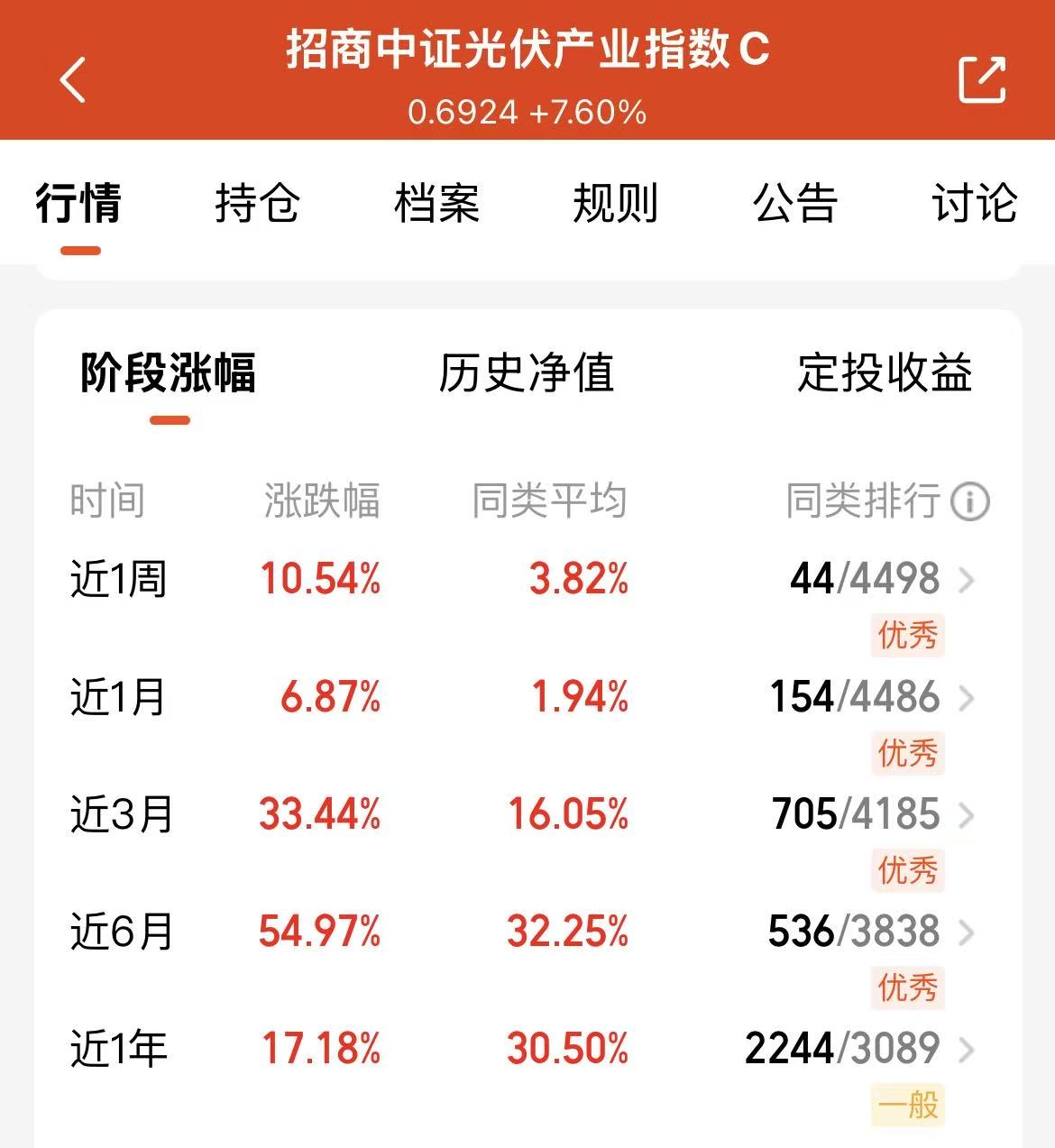 今天A股震荡调整,三大指数涨跌不一,医药、军工等都回调了,光伏赛道延续上涨了,$招商中证光伏产业指数C(OTCFUND|011967)$估值上涨1.2%,近三个月涨幅33.44%,近六个月涨幅54.97%,这是覆盖光伏全产业链的,持仓都是当下的热门方向,眼下政策上也利好多多,光伏板得配储能,前景是非常广阔的,我继续看好未来!