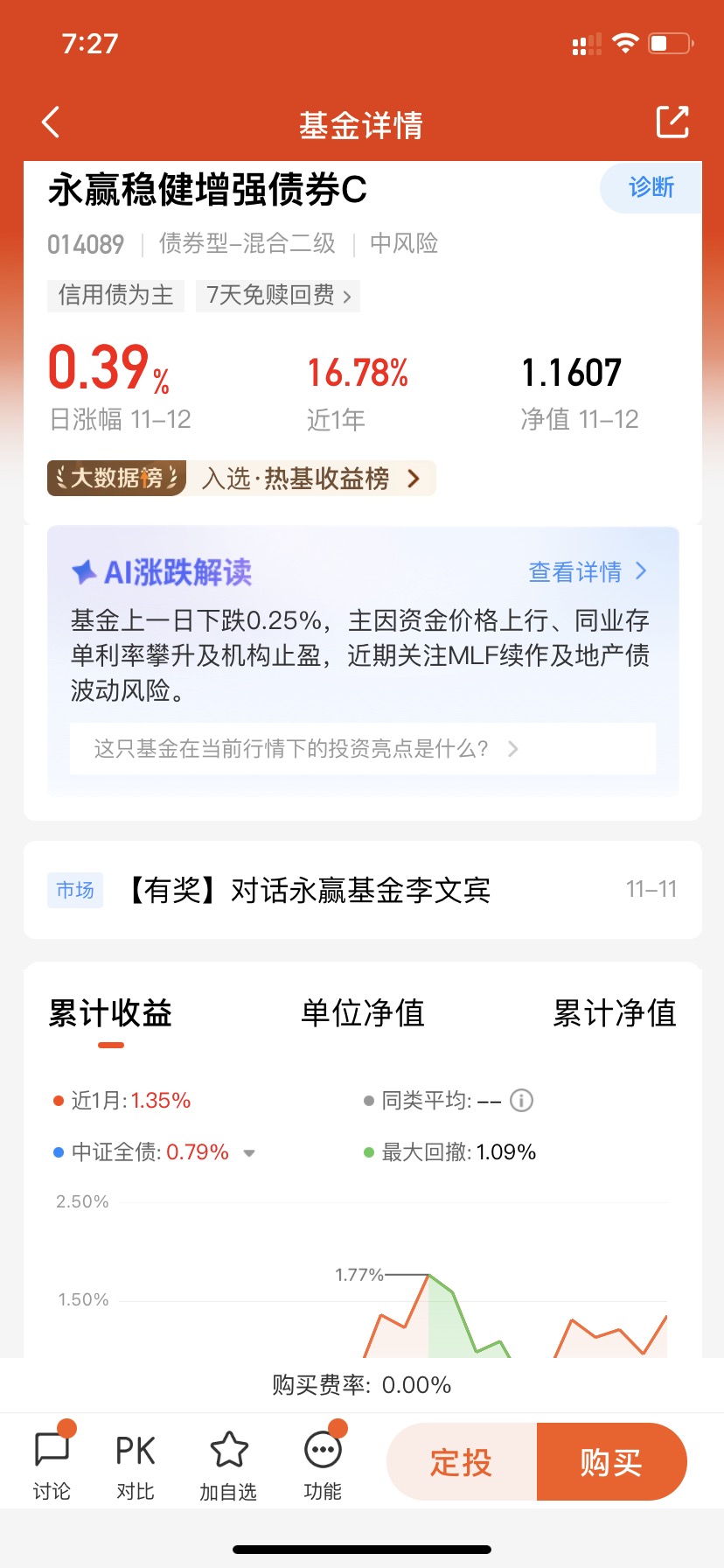 $永赢稳健增强债券C$ 今天收了39个蛋,最近虽有波动,但都是涨多跌少,修复回来的也很快,状态整体还是不错的,稳健向上!永赢稳健增强是一只7天免赎回费的固收加基金,主要以信用债和利率债固收打底,加上少量的可转债和股票增厚收益,股债搭配,收益翻倍,还是很值得期待了!#11月基金投资策略#
