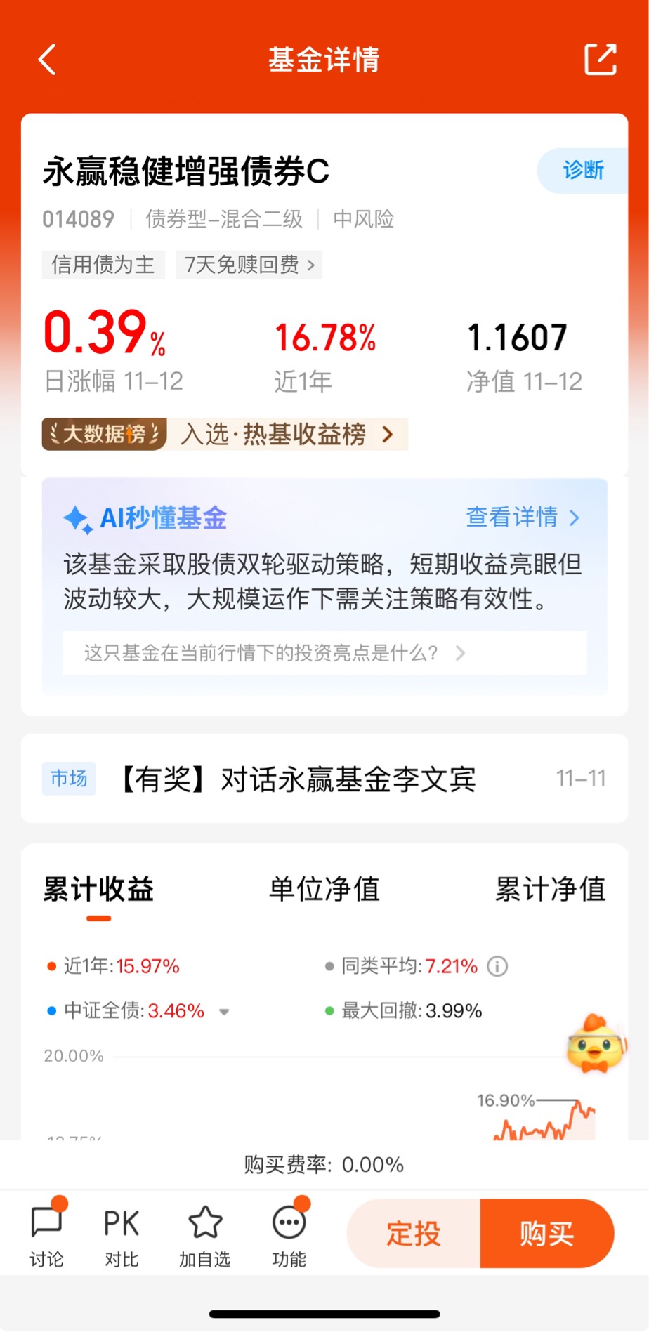 $永赢稳健增强债券C$ 今天收39个蛋,近一个月收135个蛋,近3个月收440个蛋,近6个月收1321个蛋,近一年收1678个蛋,各个阶段表现优秀!它主要通过“债基打底+权益增强”的组合策略,在风险可控的前提下争取更多收益。底层债券持仓以高等级信用债为主,这类债券就像基金的“压舱石”,收益稳定、风险较低,能确保基金有扎实的基础收益!