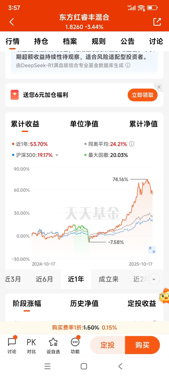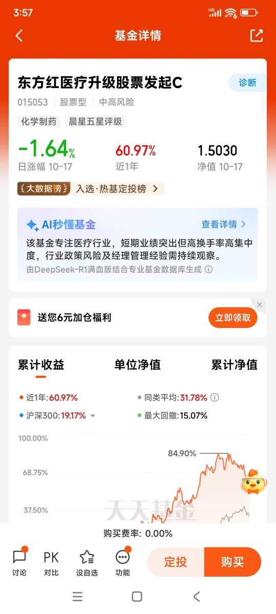 四季度创新药投资具有多方面优势。政策上,医保谈判门槛降低、降价幅度收窄,且新增商保丙类目录,同时药监局审批速度加快。业绩方面,三季度部分创新药企业绩已超预期,医保谈判落地后新药销量有望大幅增长。催化因素上,ESMO大会等国际会议密集召开,可能带来临床数据超预期和BD业务拓展机会。资金层面,公募基金对创新药龙头持仓比例提高,北向资金也在净买入。此外,创新药板块估值处于历史低位,具备一定的安全边际。目前又处在回调中,看好的,轻仓,空仓,卖飞的可以逐渐建仓了。比如东方红医疗升级股票发起C,代码015053,近一年最高净值为1.7264元,如2025年10月17日为1.5030元,回调幅度为:12.94%,看好的可以渐入,重仓的再等等,反正不怕踏空,犹豫不决的可以用定投的方法参与其中。风险提示:投资有风险入市须谨慎。@东方红资产管理。