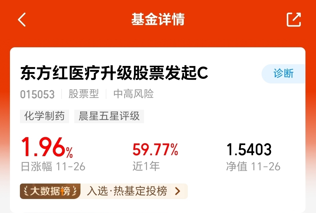 医药板块最近挺火啊,$东方红医疗升级股票发起C$ 已经涨了三天,今天上午看它的持仓大部分也是红的,说不定能冲个四连涨呢。它近1年涨近60%,还入选了热基定投榜。
