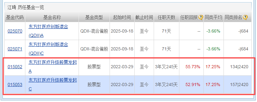 请看上图来自天天基金网的数据,东方红医疗升级股票发起式基金(A类:015052,C类:015053),成立至今3年245天,累计收益率超50%,是同类平均17.25%的3倍,排名更是遥遥领先!