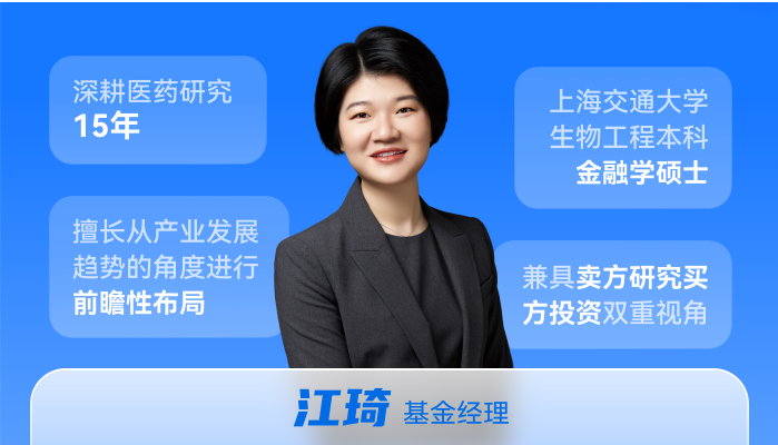 她本科是生物工程,与医药行业密切相关,硕士读的是金融。这种跨界的学习经历,使得江琦经理既具有医药相关的产业视野,也具备金融领域的投资知识,天然的非常适合做基金经理。在开始管理公募基金之前,她已在医药行业深耕十多年。