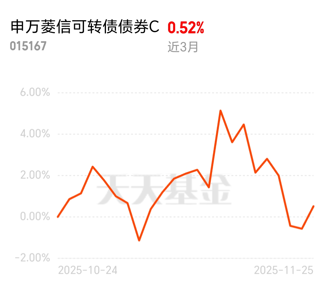 近期市场时好时坏没个准头,普通人扛不住大波动,申万菱信可转债C很靠谱。固收打底稳得住,权益增强进攻性足,投的都是近期热门的有色和电子,近3个月3.88%的收益,稳当赚钱不费劲。
