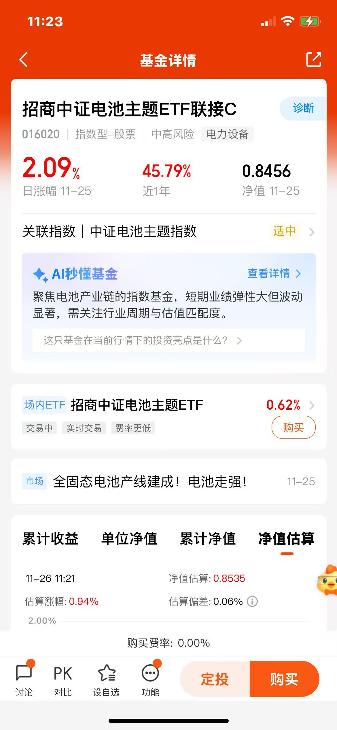 不过电池趋势表现不错,一路震荡走强!$招商中证电池主题ETF联接C(OTCFUND|016020)$昨天上涨2.09%,今天再继续上涨,反弹的很漂亮