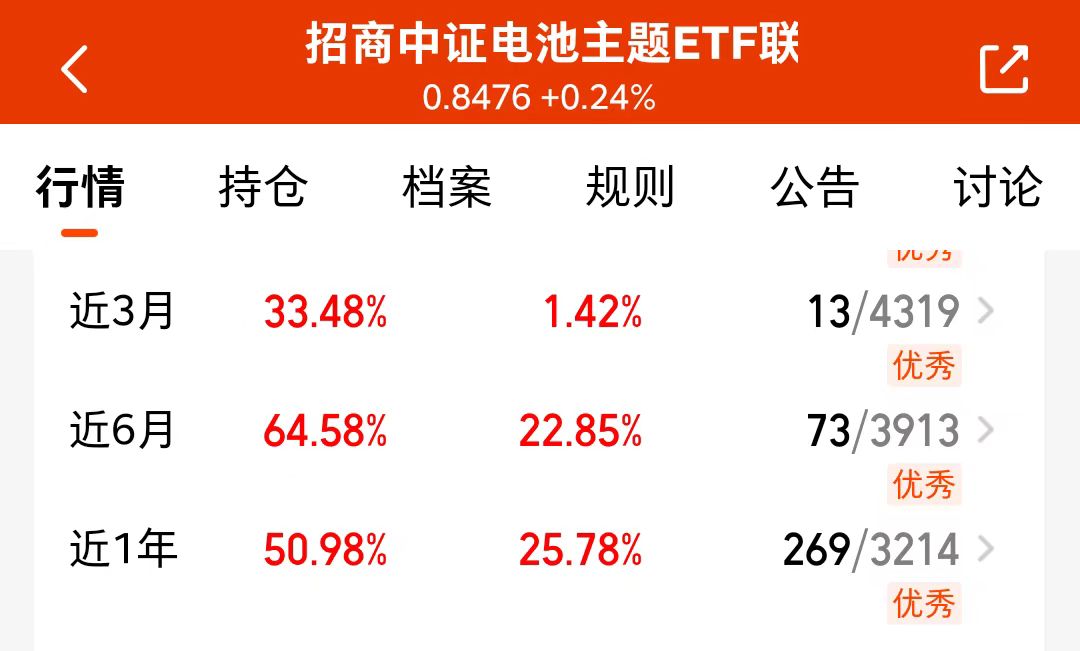 今天股市行情反弹,4连涨,全球储能概念增强,电池板块上涨,11月25日电池级碳酸锂报价9.196万元/吨,一个月飙涨21.9%,这波涨价潮直接带飞产业链,鹏辉能源、天际股份等企业都宣布满产满销,宁德时代签署了200GWh的十年采购大单;国内首条大容量全固态电池产线刚建成投产,能量密度直接翻倍,计划2026年装车测试。固态电池板块行情值得期待。我关注的是$招商中证电池主题ETF联接C(OTCFUND|016020)$,近半年上涨64.58%。业绩优秀。