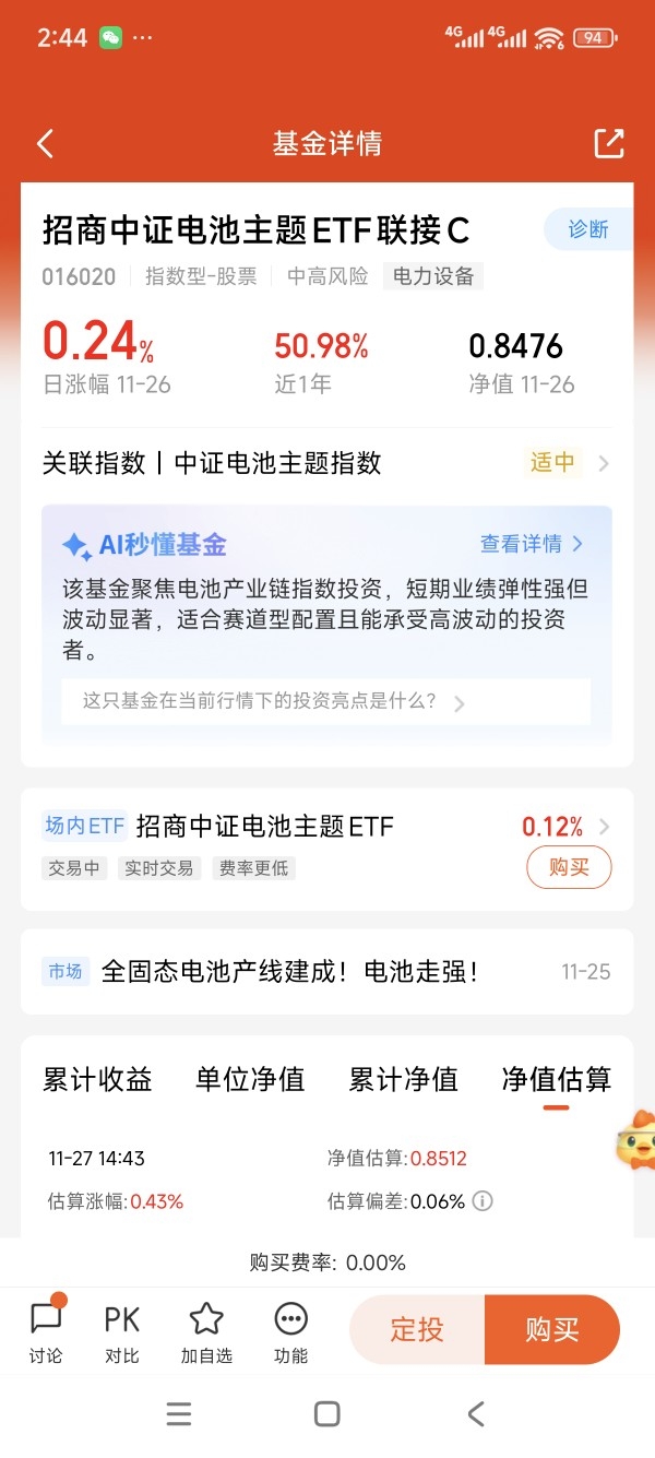 $招商中证电池主题ETF联接C$ 这只聚焦电池指数的基金。紧跟中证电池主题指数,全面覆盖了电池产业的上下游产业链。而且对比其他指数来看,该指数中固态电池跟储能电池的含比更高。而且在本轮行情中,表现好的就是固态电池跟储能电池。所以稳定抓住了本轮的主线。从业绩表现的来看,昨天上涨了0.24%,而同类基金昨天都是负收益,近一年涨幅50.98%,长期同类也是做到了优秀,今天再次做到了稳定上涨,期待继续突破呀!