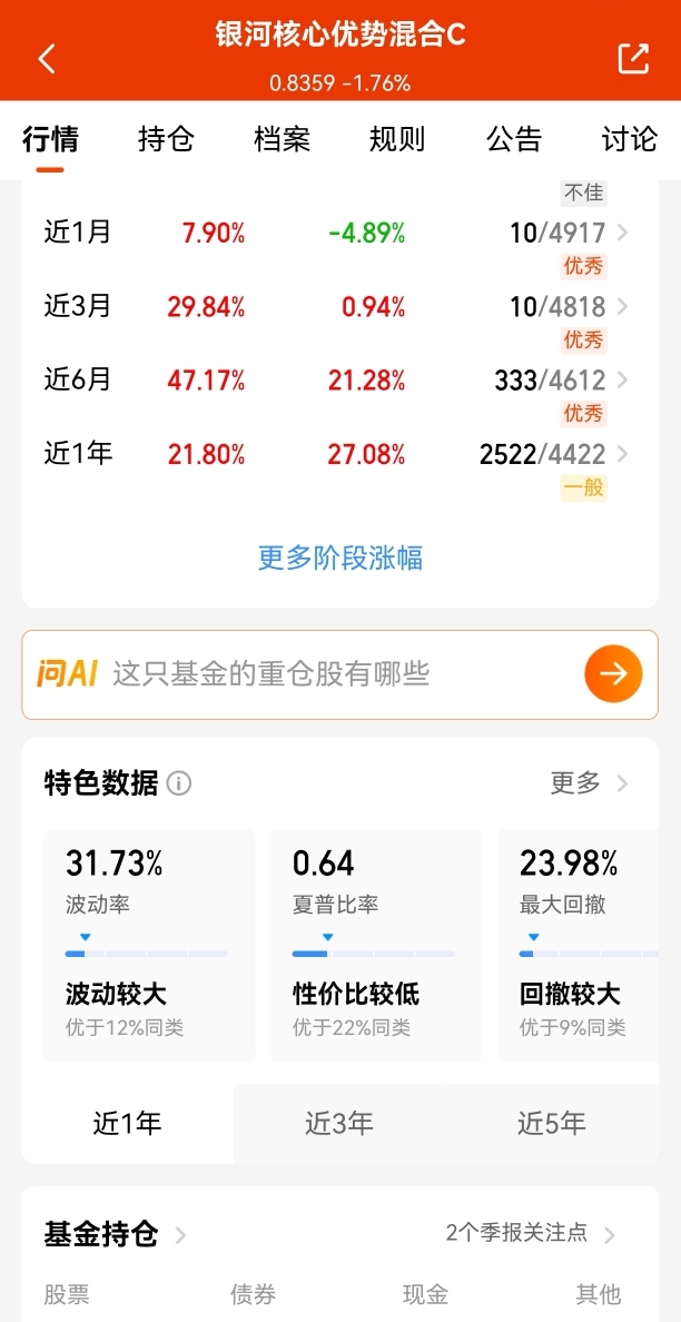 继续加仓$银河核心优势混合C$ 这只基主要持仓主要聚焦新能源产业链,包括迈为股份、海博思创、宁德时代、海力风电等电力设备优质企业,还有亿纬锂能、阳光电源等锂电、光伏新能源方向,作为近期一大主线,反弹起来也是备受资金青睐了,这只基金收益也不错,近3个月涨了29.84%,近半年收益47.17%,跑赢大多数同类了,排名非常靠前,我觉得这也说明经理择时能力还是不错滴,调整后也有足够修复动力啦!
