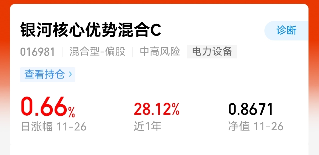 又是上涨的一天,$银河核心优势混合C$ 继续上涨,今日涨幅0.66%,业绩还是很给力的,新能源上涨空间比较大,在市场需求强劲增长的背景下,锂电池产业链多家企业进入满产满销模式,整体来看趋势可以。