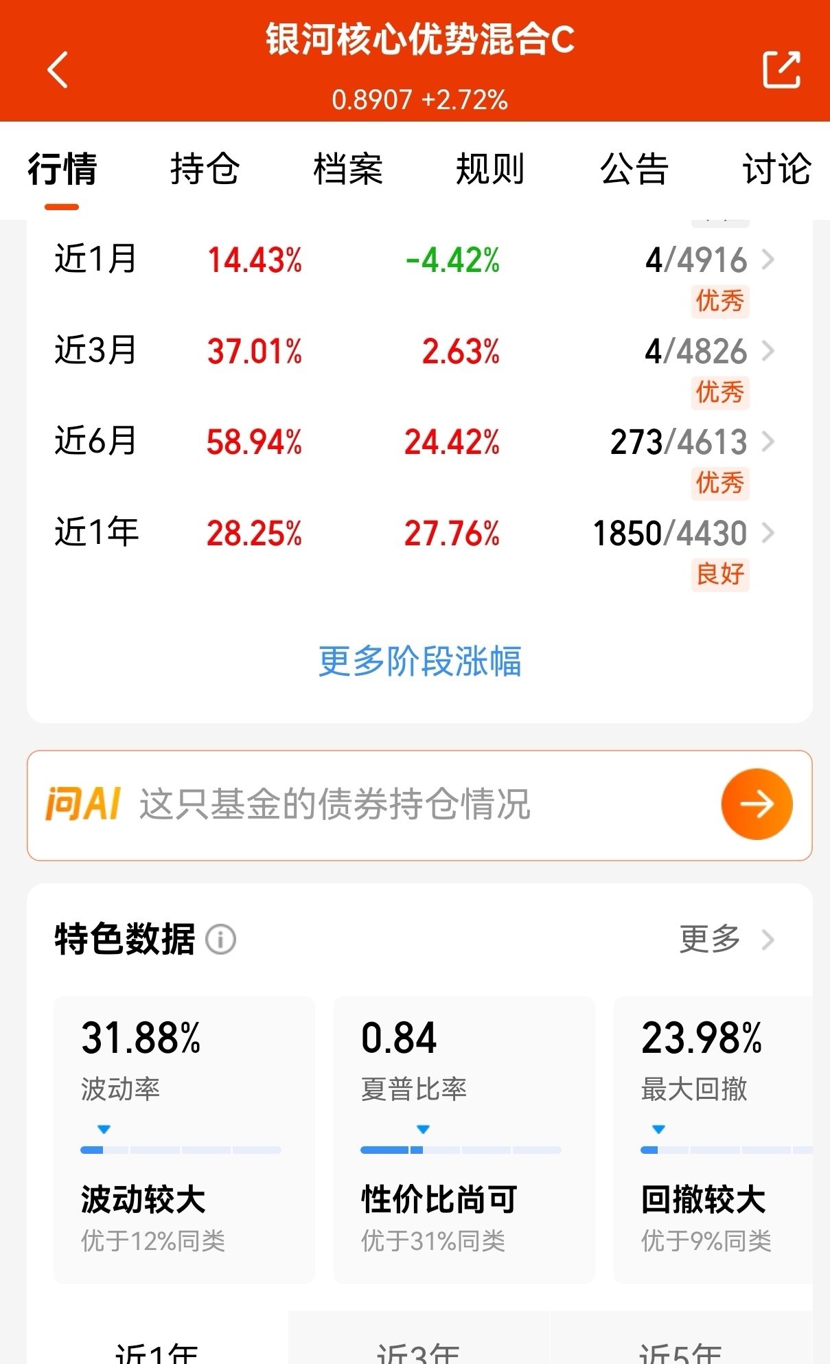 今天是11月最后一个交易日,指数在经历四连阳后,周五继续翻红。在这种节奏下,我把目光重新放到了$银河核心优势混合C$ 上。这只主动基主要围绕新能源产业链深度布局的主动管理基金,方向明确、风格稳定,整体配置既有龙头压舱,也有潜力股带来弹性,看持仓第一重仓迈为股份继续大涨5.98%,涨势不错,而且从历史表现来看,这只基金确实能涨抗跌,近三个月+37.01%,近六个月+58.94%,各阶段业绩优秀赚钱能力强,而且经过前期调整风险释放后性价比更高了,近期开始连涨了,继续定投买起来。