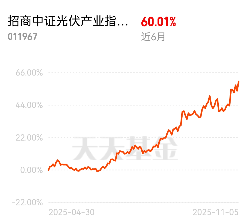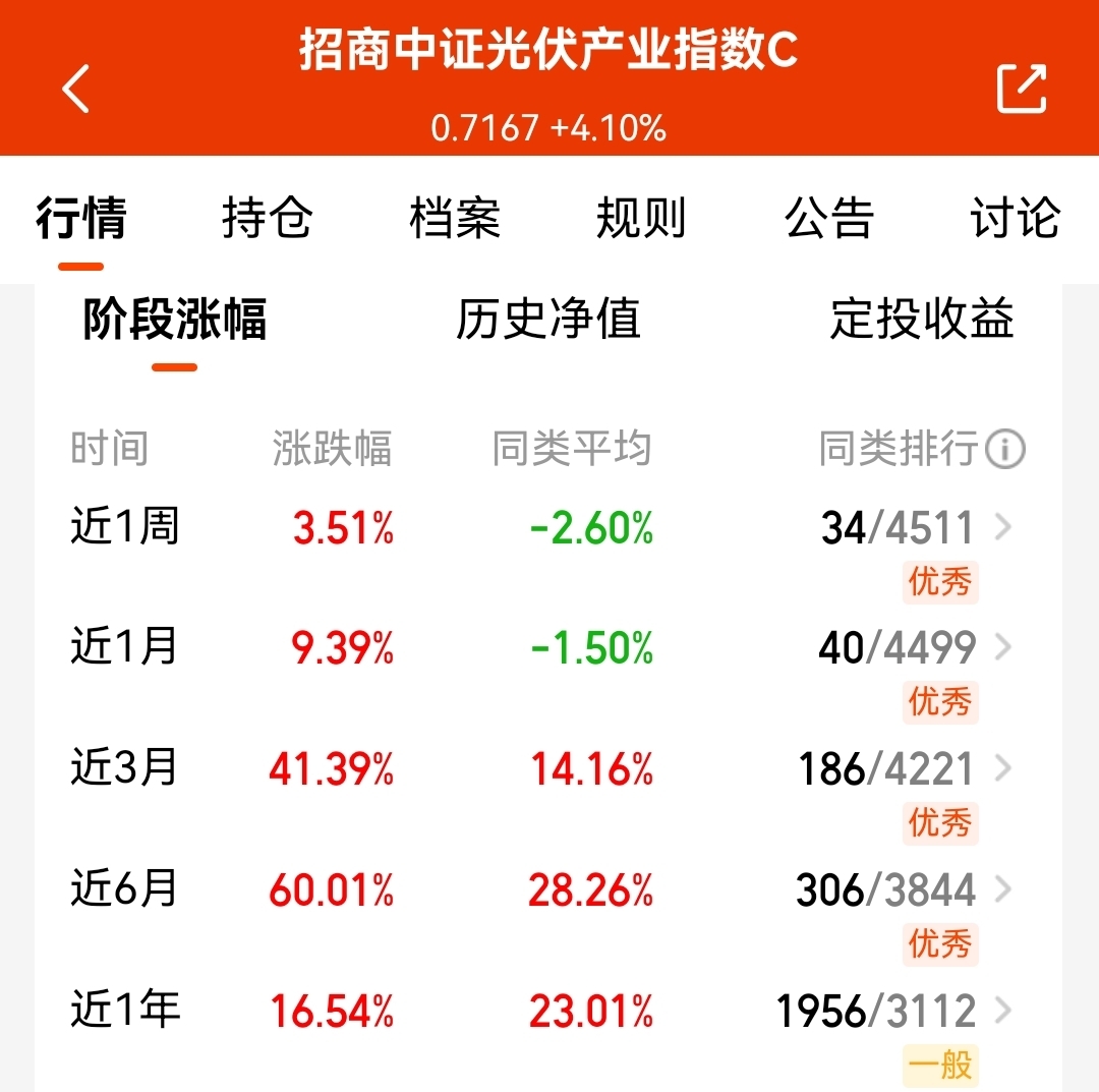 这支$招商中证光伏产业指数C$ 目前估值也是大涨潮2%,连续反弹两天了,跟踪光伏板块,近2个月收益9.39%,近3个月已经涨41.39%了,相对多数科技方向,近期行情确实还不错咯;