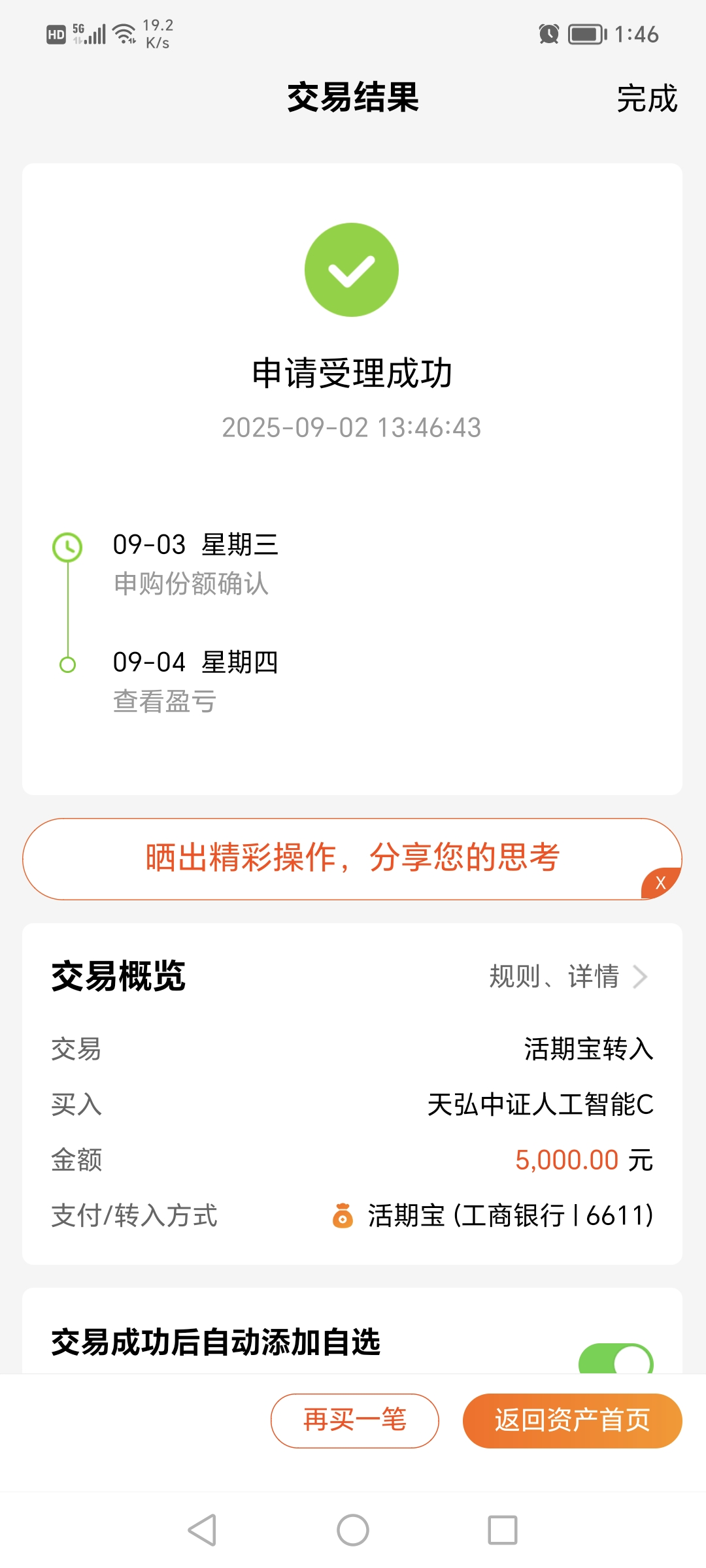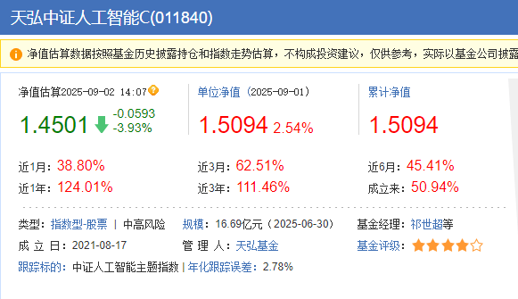 $天弘中证人工智能C(OTCFUND|011840)$今天加仓5000元。