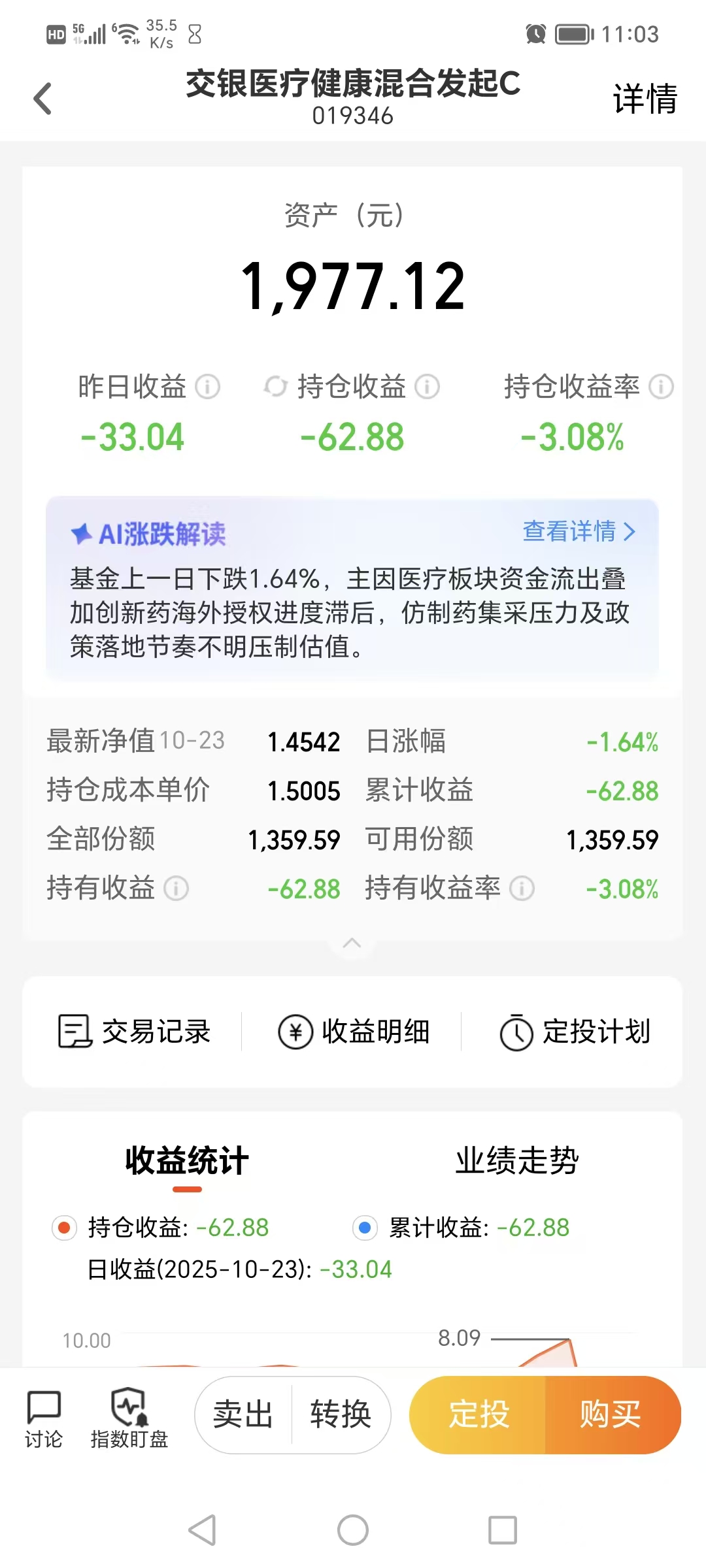 我觉得当前医药属于跌无可跌的阶段,今天加仓交银医疗健康混合发起C 1000元,这个品种主要仓位在创新药方向,近期医保目录调整首次引入“商业健康保险创新药目录”,对高值创新药、CXO、医疗IT等细分板块是放量催化剂,我认为将直接拉动相关企业业绩增长,这也是近期创新药龙头已经拒绝下跌逐步盘升的核心原因。当下市场冰点状态明显,成交量萎缩交投不活跃,利好消息无法反映,对投资人来说无疑就是最好的潜伏机会了,当然要把握起来。