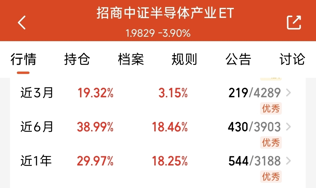 $招商中证半导体产业ETF发起式联接C$ 这只专注半导体产业的指数基金。紧跟中证半导体产业指数。全面覆盖了半导体的上下游产业链。无论哪一个方向上涨都能够持续受益。3月上涨了19.32%。近6月上涨了38.99%。都是同类平均业绩的两倍还多。而且采用指数化的投资。遇到波动,稳定性也是更好的。期待未来继续创新高!#沪指跌破3900点关口! 如何应对?#