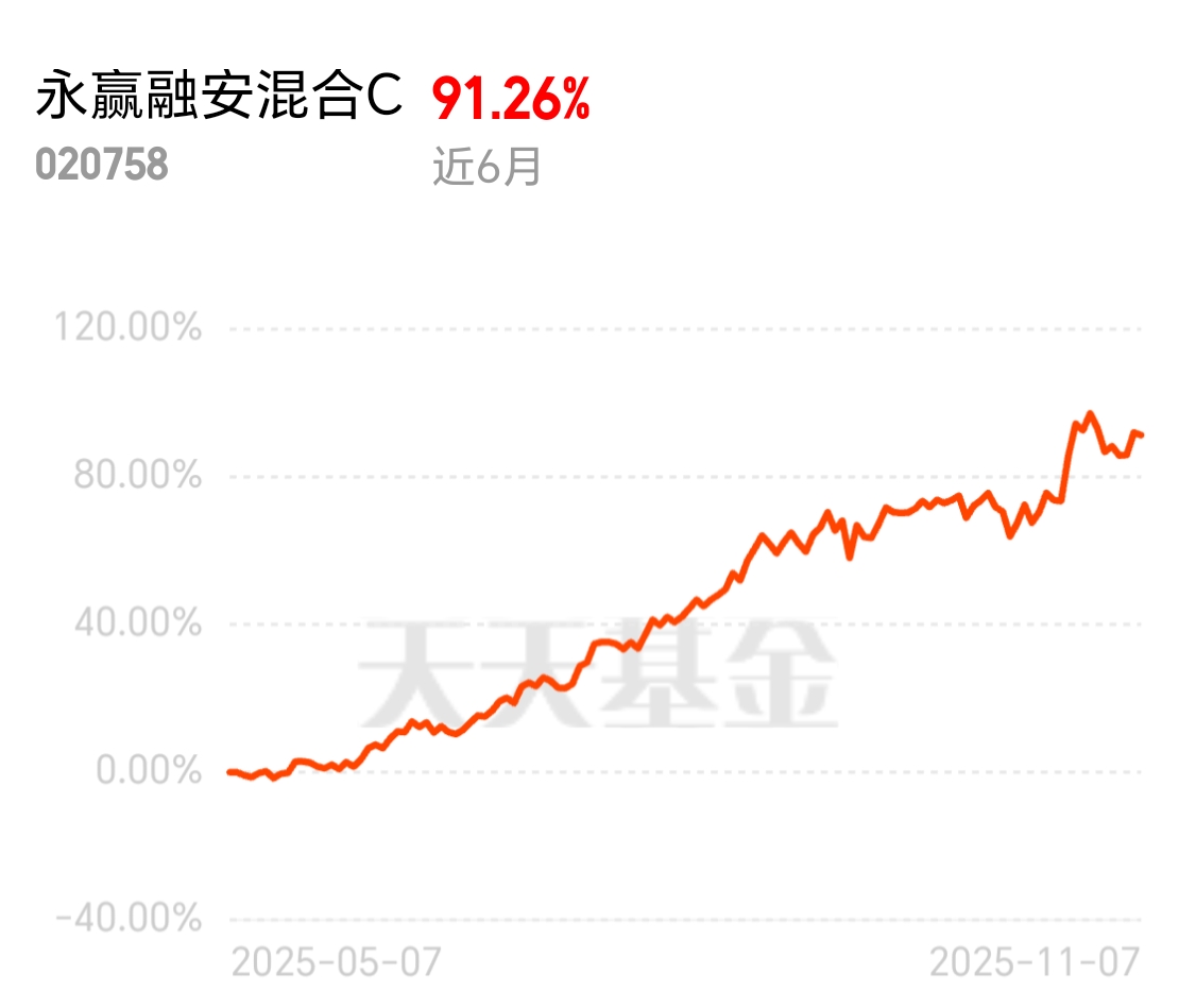 今年市场行情,无疑是科技牛,热点行情在科技各个板块之间,来回切换。$永赢融安混合C$ 在AI算力、半导体、光通信、存储芯片待领域切换自如。看业绩,近一月涨超10%,,近半年涨超91%,表现亮眼,同类排名靠前,看来基金经理的操作策略攻守兼备。趁今天市场倒车接人,准备配置起来。$永赢融安混合C$