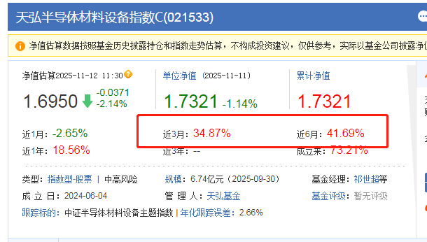 $天弘半导体材料设备指数C(OTCFUND|021533)$半导体芯片及设备是科技主线,今天跳水了,不过总体还是看涨不变的,业绩长线也不错,近6个月上涨41.69%,目前看半导体芯片的估值不高,科技成长风格有所调整,市场风格再平衡之后,半导体及设备大概率仍是科技成长的主要方向。在市场风险偏好较高,流动性充裕的环境里,半导体设备指数回调就是机会了,可以慢慢加,今天加3000元。