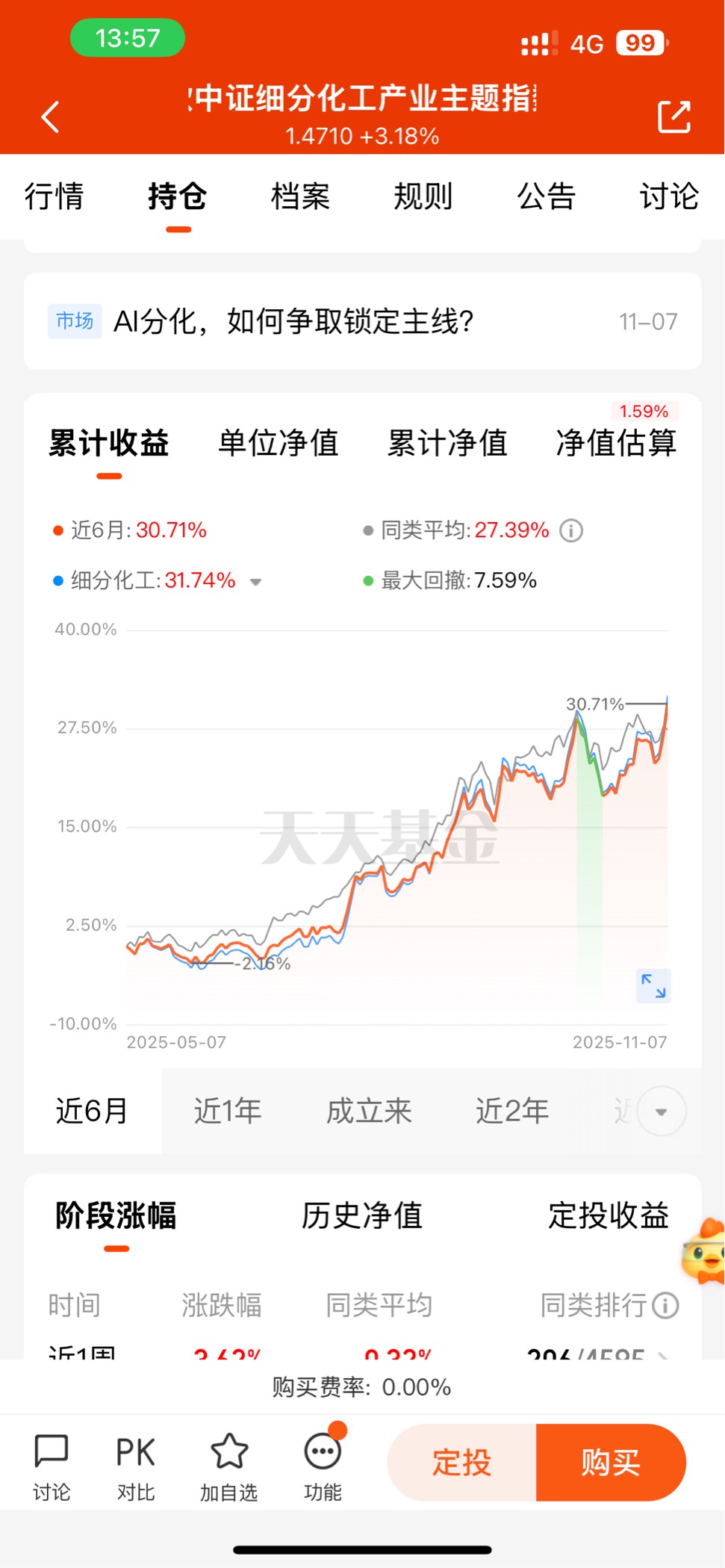 z最近6个月涨得很666啊,新高不断,这是化工要接科技的位置了?这个基金一周的涨幅比化工指数要多三四个点啊,强