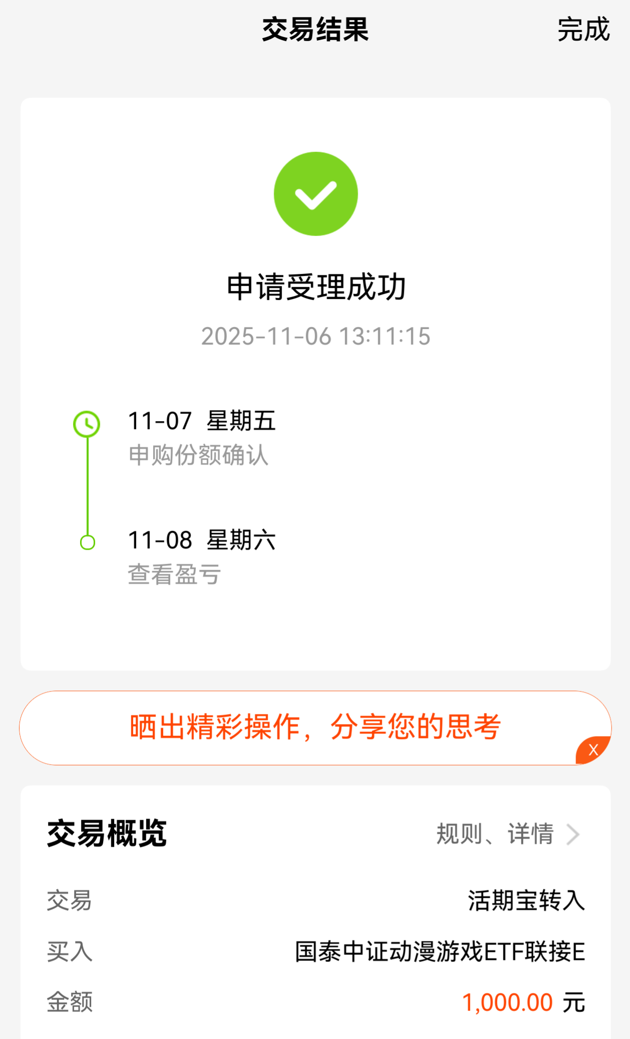 今天加仓1000元国泰中证动漫游戏ETF联接E(022481)。
