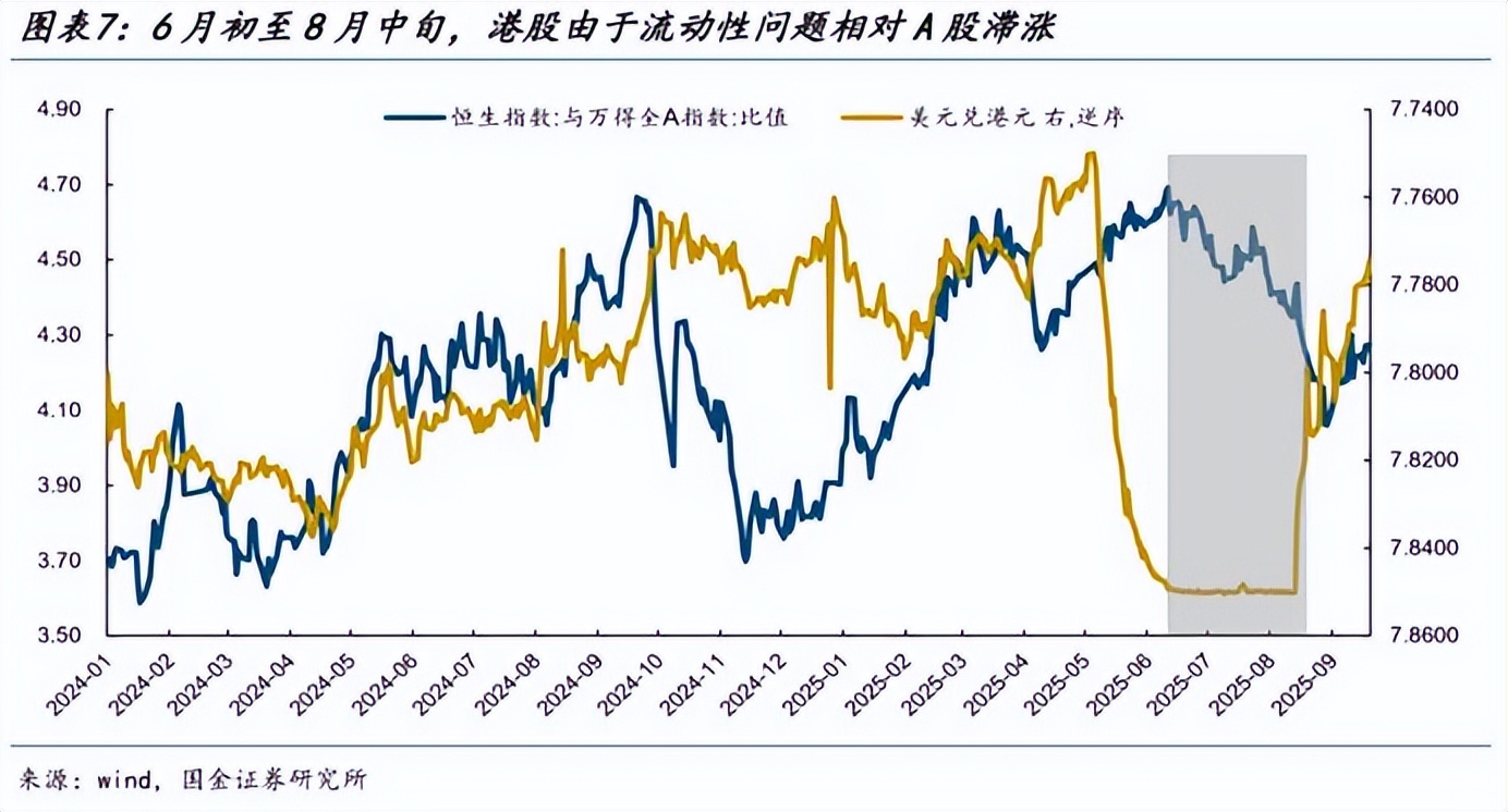 另一方面,自今年6月初至8月中旬,由于港元兑美元长时间触发弱方兑换保证,香港金管局通过买入港币卖出美元,在维持港币汇率稳定,而这一操作也对港股市场流动性形成了压制。