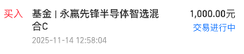 我加仓$永赢先锋半导体智选混合发起C(OTCFUND|025209)$1000元,最近存储芯片连续出现上涨,这个位置有个调整正常,不然一直涨也没有机会上车呀,趁这会看净值估算跌6.7%左右,我认为是上车的好时机,果断加仓一笔。