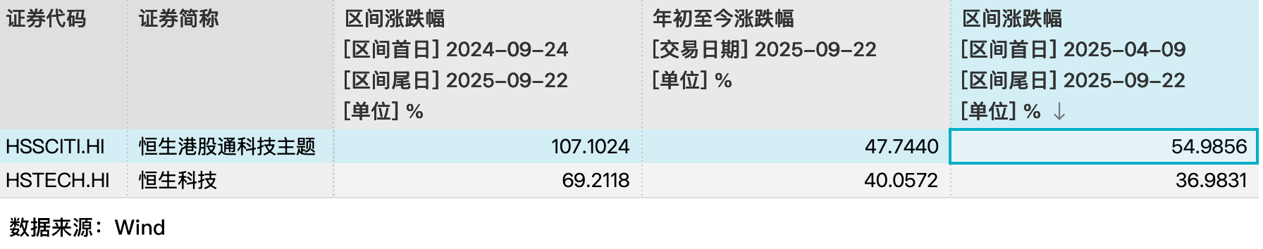 Wind统计显示,2024/9/24-2025/9/22区间,恒生港股通科技上涨107.10%,恒生科技上涨69.21%;2025年初以来(截至9月22日),恒生港股通科技上涨47.74%,恒生科技上涨40.06%;上轮“黄金坑”以来(2025/4/9-2025/9/22),恒生港股通科技上涨54.99%,恒生科技上涨36.98%。