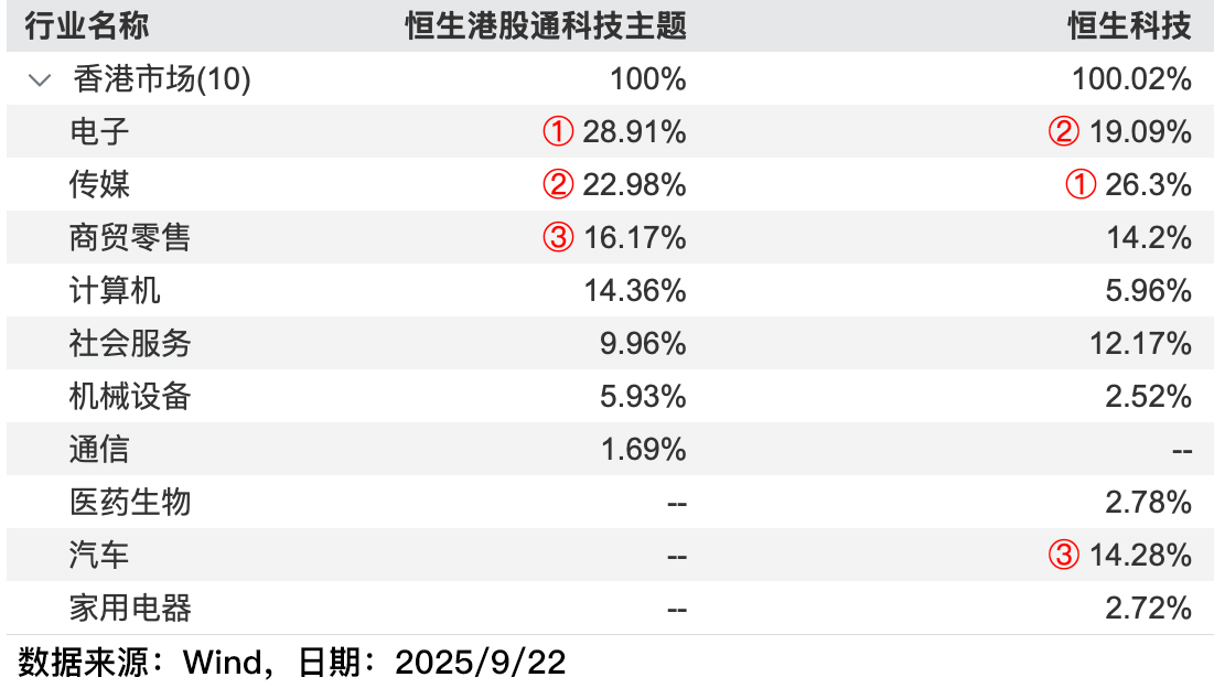 从行业分布来看,恒生科技主要覆盖于传媒、电子、汽车,其余还囊括商贸零售、社会服务、计算机、医药生物、机械设备等行业。而恒生港股通科技主题指数编制上,剔除了医药、家电、汽车等非核心科技板块,相比之下更加纯粹地聚焦于以AI(人工智能)和Semi(半导体)为代表的互联网、半导体等核心科技领域,科技纯度相对更高。