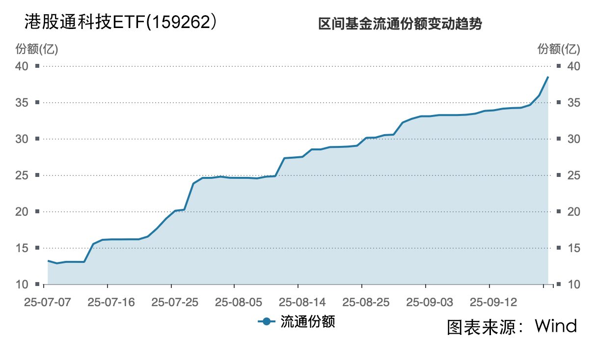 今年7月上市以来,港股通科技ETF(159262)份额和规模节节攀升,呈现了强大的“吸金”能力。Wind数据显示,8月份累计净流入18.80亿份,月末规模为37.03亿元;9月份至今(截至22日)累计净流入25.11亿份,流通规模为48.12亿元,流动性好。