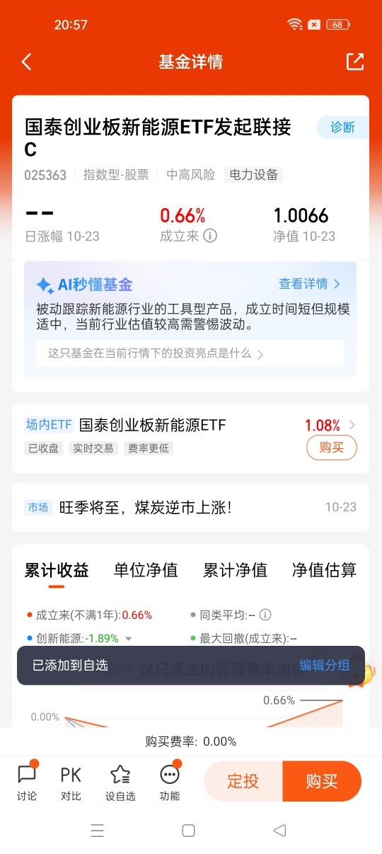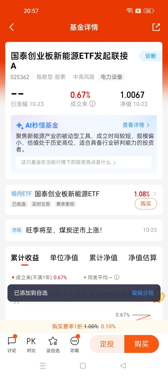 费率结构颇具优势,管理费0.5%/年、托管费0.1%/年,C类份额免申购费且持有7天后免赎回费,适配短期波段操作与长期布局需求 。国泰基金在ETF领域深耕多年,旗下新能源相关ETF工具齐全,管理规模超7000亿元,为基金的精准跟踪提供了坚实支撑 。截至2025年10月17日,基金单位净值为0.9871元,规模达3.95亿元,处于适中区间便于灵活运作 。