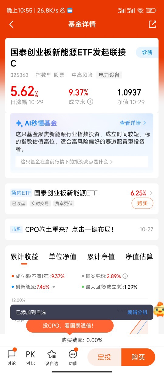 基于这样的板块判断,我的投资思路聚焦“借道指数、灵活布局、控制节奏”三大核心。首先是工具选择上,放弃个股博弈转而拥抱指数基金,国泰创业板新能源ETF发起联接C 便是优选。这只基金跟踪的创业板新能源指数日涨跌幅达20%,中小市值成分股集中,自基日以来涨幅达233%,远超传统新能源指数,能精准捕捉技术迭代带来的结构性机会 。更关键的是其费率优势:免申购费,持有满7天免赎回费,年费仅0.8%左右,非常适合应对板块高波动特性的波段操作或定投布局 。