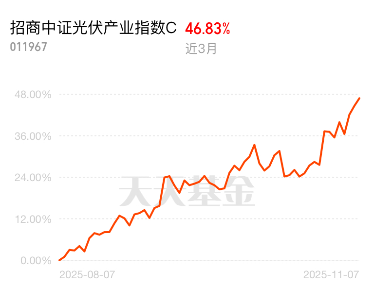 国内光伏企业的订单都排到好几个月后了,生产忙不过来,业绩肯定差不了。招商中证光伏产业指数C近3个月涨了46.83%,跟着企业的订单量涨,业绩有实打实的支撑。$招商中证光伏产业指数C$
