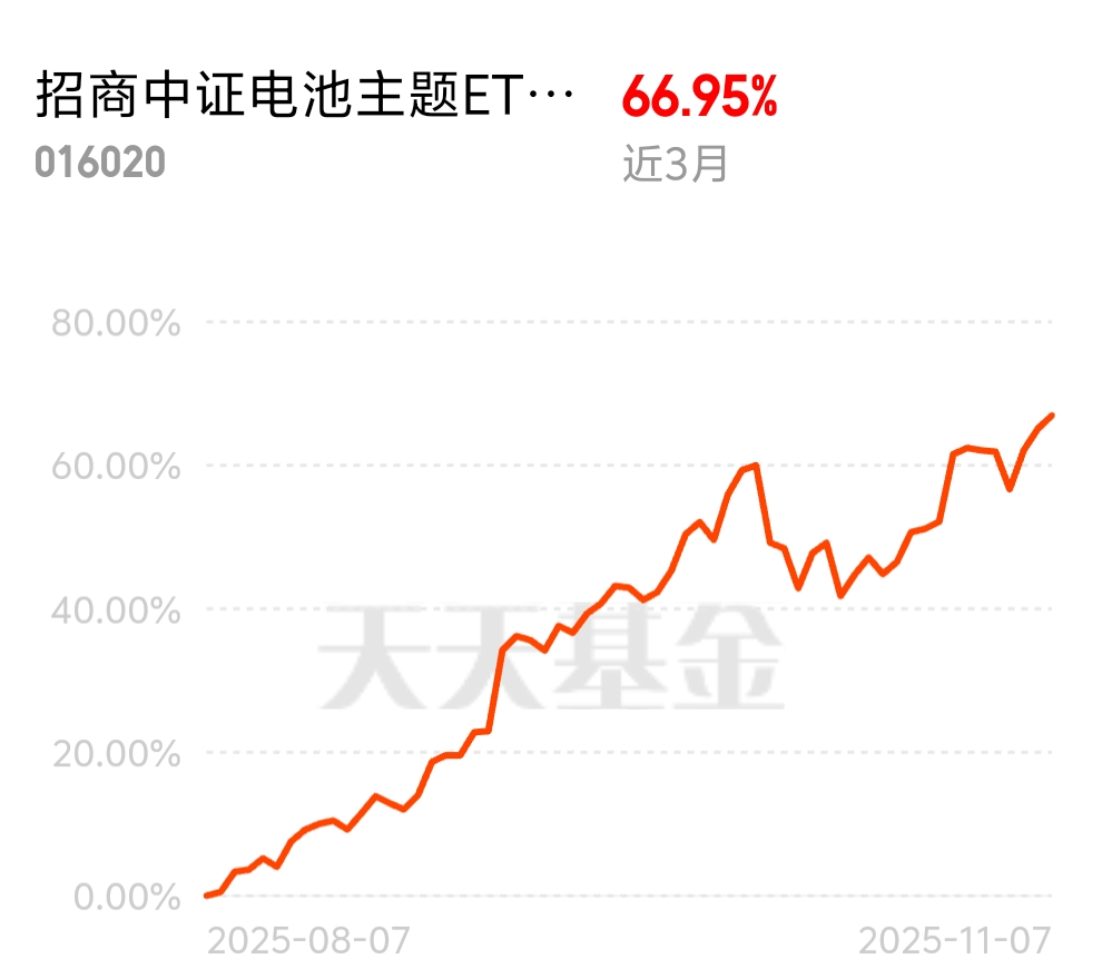 现在固态电池技术频频突破,储能需求也跟着井喷,电池板块今日继续保持强势劲头。招商中证电池主题ETF联接C太给力了,近3个月收益冲到66.95%,今日表现依旧亮眼,跟着行业景气度走,这份收益确实让人安心。$招商中证电池主题ETF联接C$