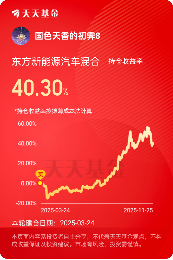 新能源今天这波收复失地确实稳,[东方新能源汽车主题混合]能吃到这波红利也正常——毕竟是紧扣赛道的主题基。不过这40%+的收益也是拿住了回调周期才有的,长期向上逻辑明确的话,后续逢低布局应该还是有空间~$东方新能源汽车混合$ #晒收益#