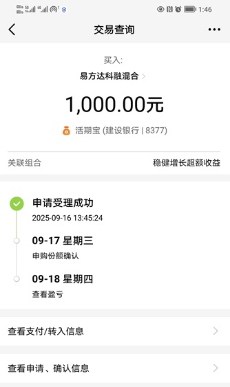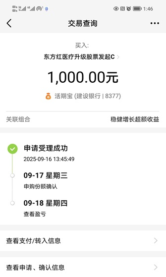 3.医疗创新:我今天新建仓$东方红医疗升级股票发起C(OTCFUND|015053)$ 2000元。这支基金是一支布局医疗产业升级主题的股票型基金,深度布局创新药,生物科技等科技高成长领域,近1年涨97.13%,近6月涨56.10%,近3月涨15.33%,今年以来涨幅达到了78.09%,取得了非常不错的业绩。基金经理江琦擅长在医药板块中做组合,自上而下选子板块,自下而上精选个股,优选有强成长性和成长潜力和拐点型低估值公司。她目前正在发行新产品$东方红医疗创新混合(QDII)A(OTCFUND|025070)$ /$东方红医疗创新混合(QDII)C(OTCFUND|025071)$ ,这支是同样是医药主题,但可以国内外多市场布局,方便抓住美即将降息带来的美股港股创新药发展机会。今天医疗创新混合(QDII)提前结募,感兴趣的可以抓紧上车一波。下面我晒一下买入操作记录: