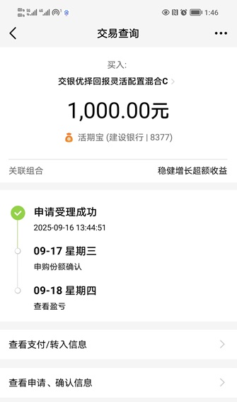 1.优择回报:我今天继续加仓$交银优择回报灵活配置混合C(OTCFUND|519771)$ 1000元。本基金是一支灵活配置偏股型基金,目前重点布局了通信设备、电子芯片半导体等科技成长领域,契合新基建与产业升级主线,可以简单理解为人工智能+算力组合,紧紧抓住当前科技热门赛道,取得了非常不错的过往业绩,近1年涨122.45%,近6月涨91.00%,近3月涨97.05%,近1月涨30.84%,近1周涨9.17%,表现非常优秀。近期科技成长方向迎来一波快速调整,本基金近1周回撤很少,真正涨的时候很猛,跌的时候又很温柔,持基体验感倍爽。今天虽然大盘还没有明显反弹,但大科技整体情绪明显回暖,算力、CPO、液冷、机器人等都有不错的反弹,资金再一次回补仓位。我看好本基金接下来的表现,今天趁着还没有大涨,继续加仓本基金。下面我晒一下买入操作记录: