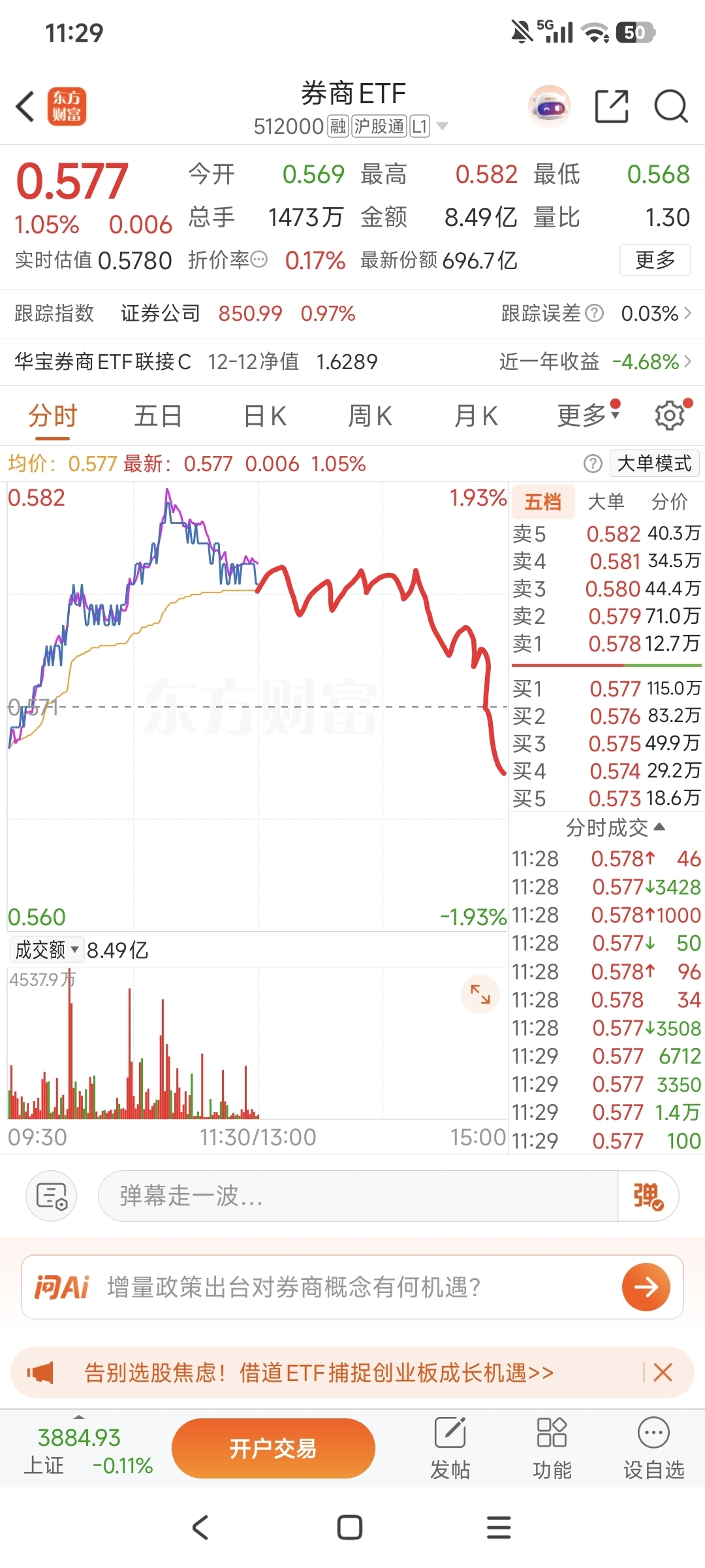 $券商ETF(SH512000)$ 预计下午震荡下行