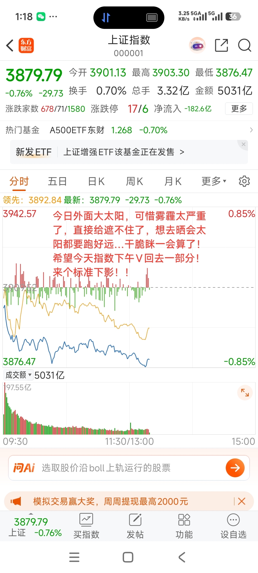 今日外面大太阳,可惜雾霾太严重了,直接给遮不住了,想去晒会太阳都要跑好远…干脆眯一会算了!希望今天指数下午V回去一部分!来个标准下影!!
