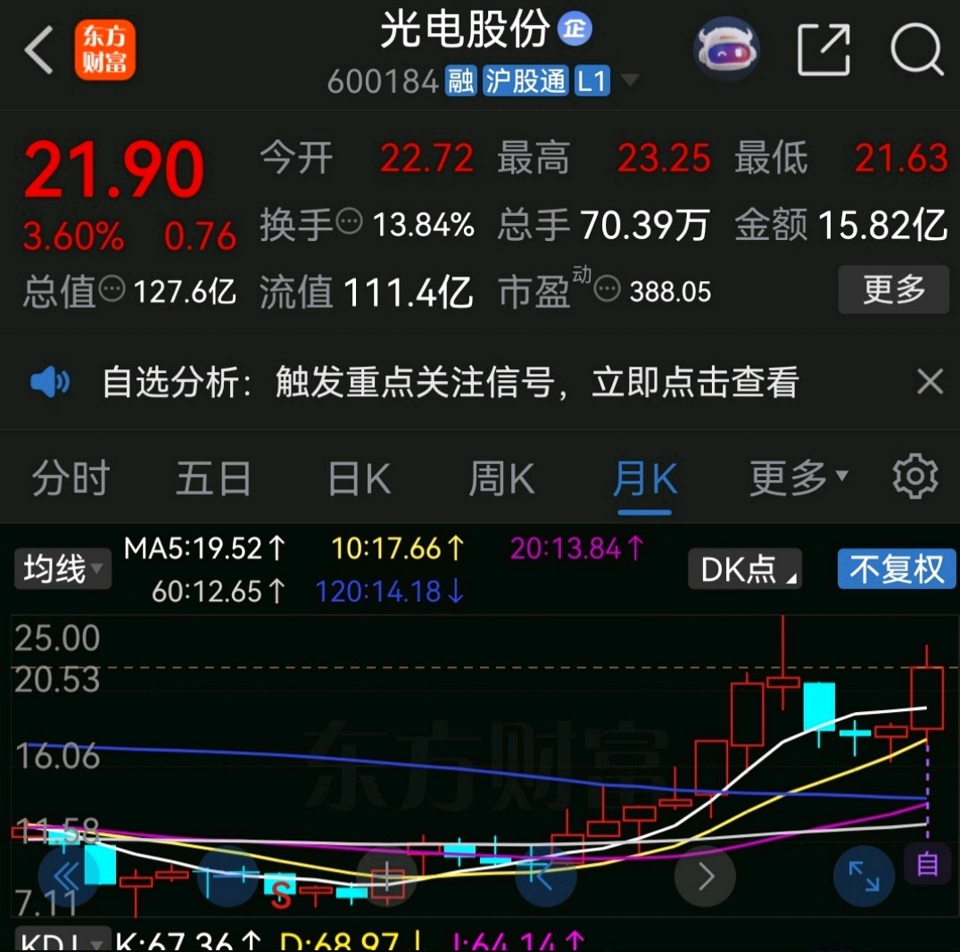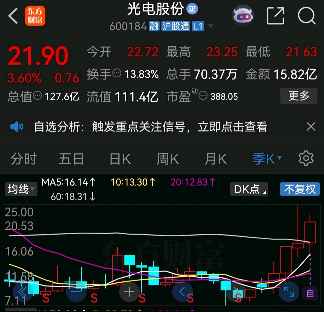 航发科技会复制光电股份走势光电上个季度K长上影线,本季度目前在收复上季度上影线过