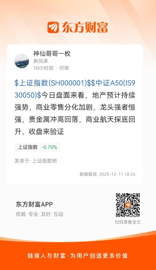 $上证指数(SH000001)$$中证A50(IS930050)$今日盘面来看,地产预计持续强势,商业零售分化加剧,龙头强者恒强,贵金属冲高回落,商业航天探底回升,收盘来验证