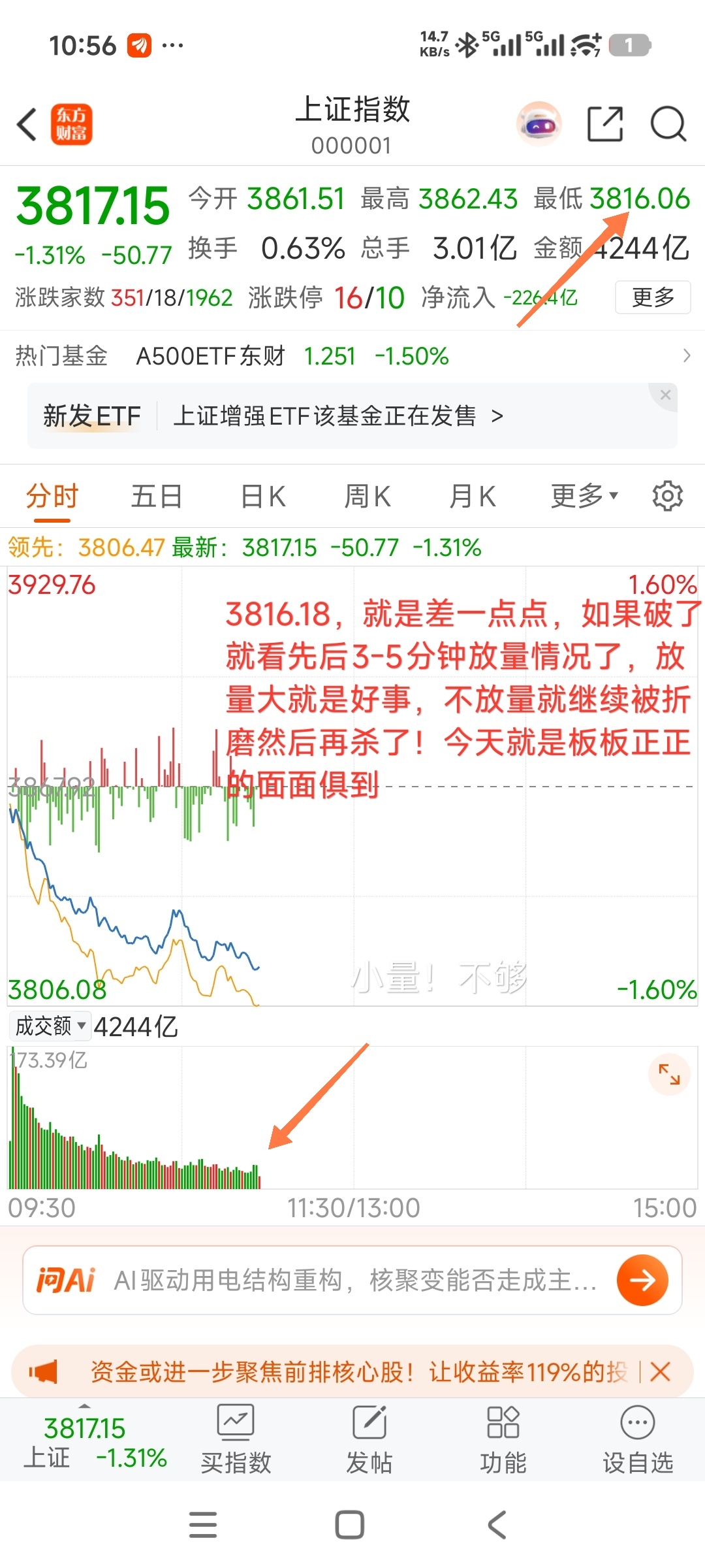 3816.18,就是差一点点,如果破了就看先后3-5分钟放量情况了,放量大就是好事,不放量就继续被折磨然后再杀了!今天就是板板正正的面面俱到