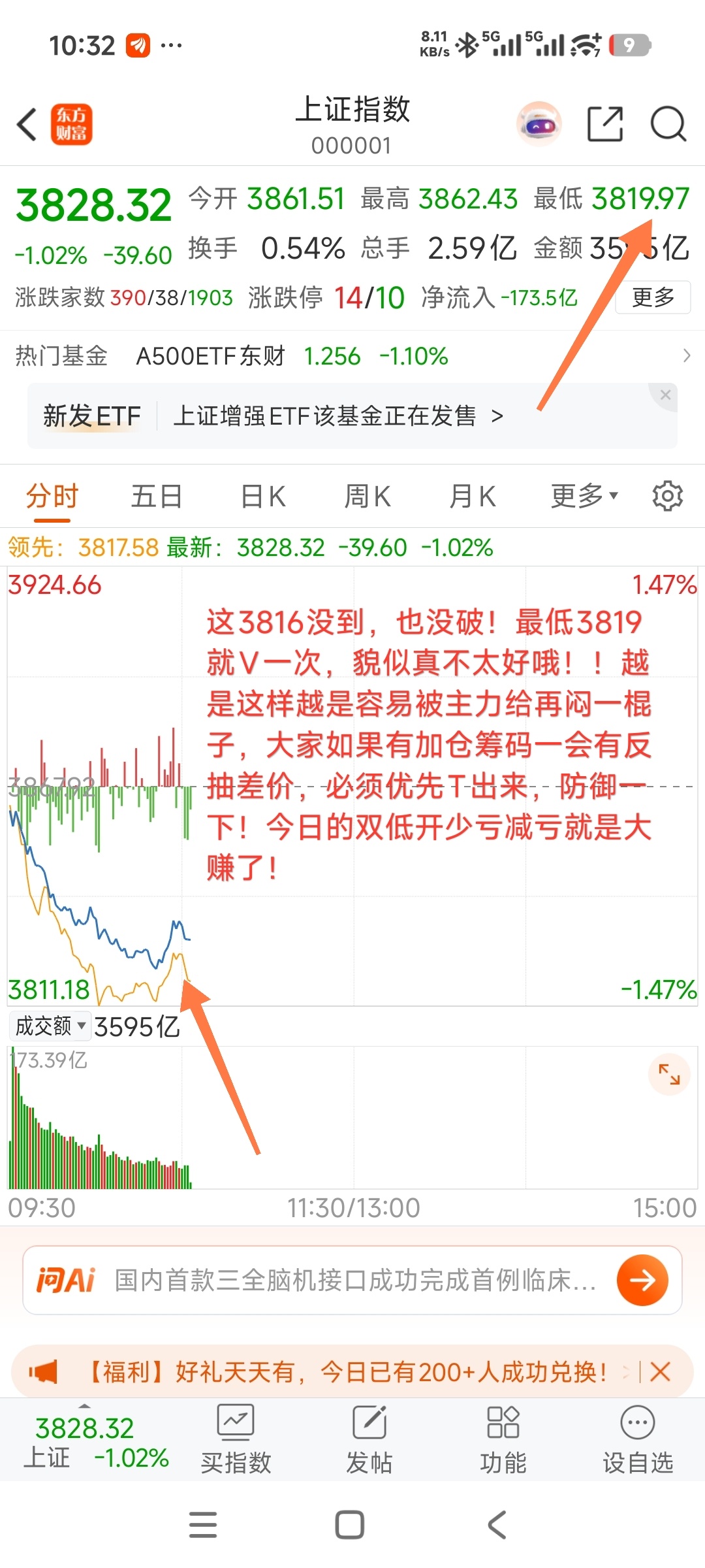 这3816没到,也没破!最低3819就V一次,貌似真不太好哦!!越是这样越是容易被主力给再闷一棍子,大家如果有加仓筹码一会有反抽差价,必须优先T出来,防御一下!今日的双低开少亏减亏就是大赚了!