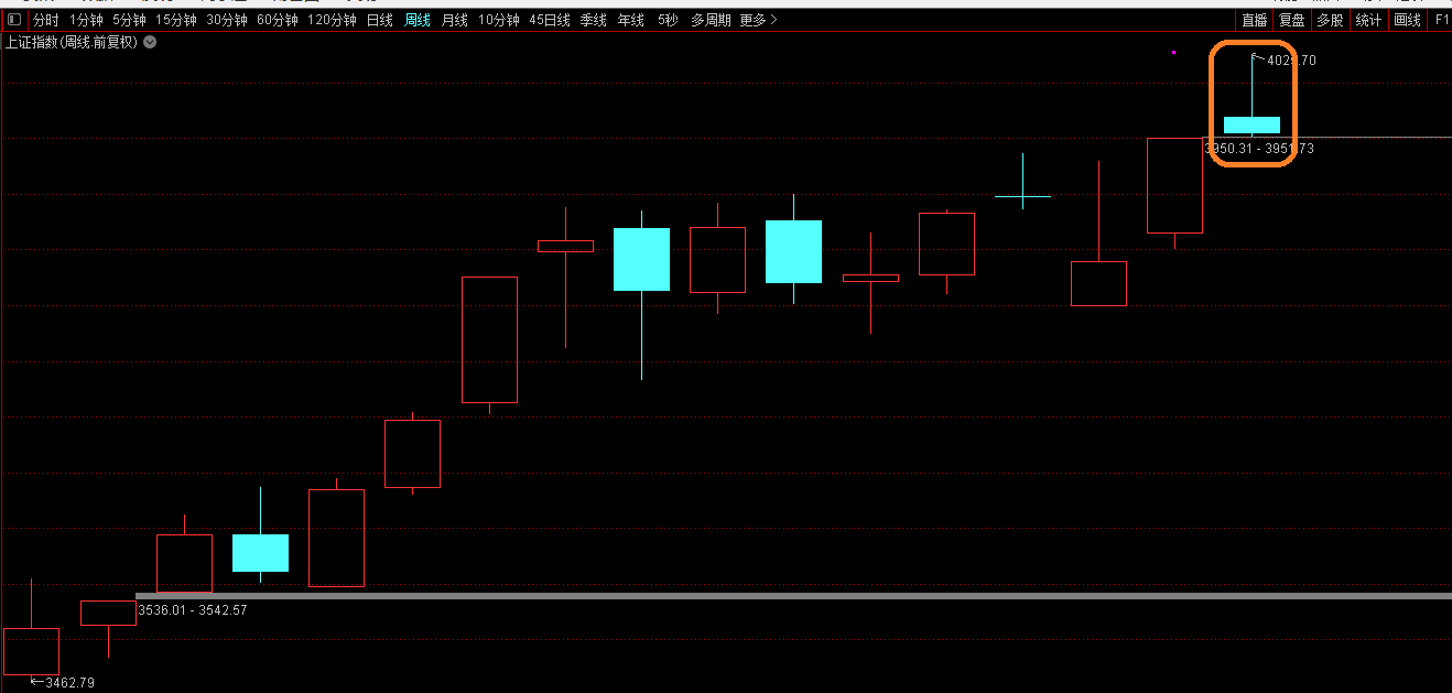 1. 在高位出现周线级别冲高回落,并留下了长上引线,说明这里抛压很大。