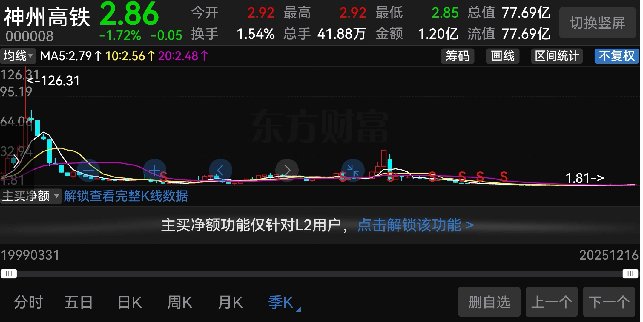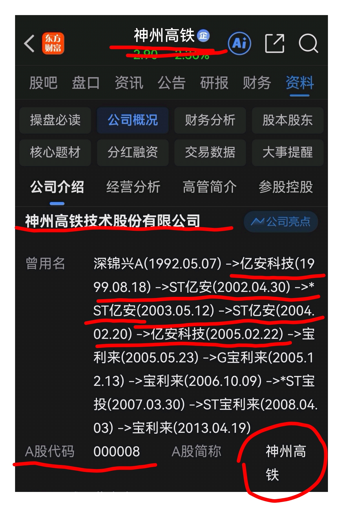 比如:亿安科技(000008)1999年大A未一的一只吹上天的100元以上股票,变成了神州高铁(000008)现价2.86元。