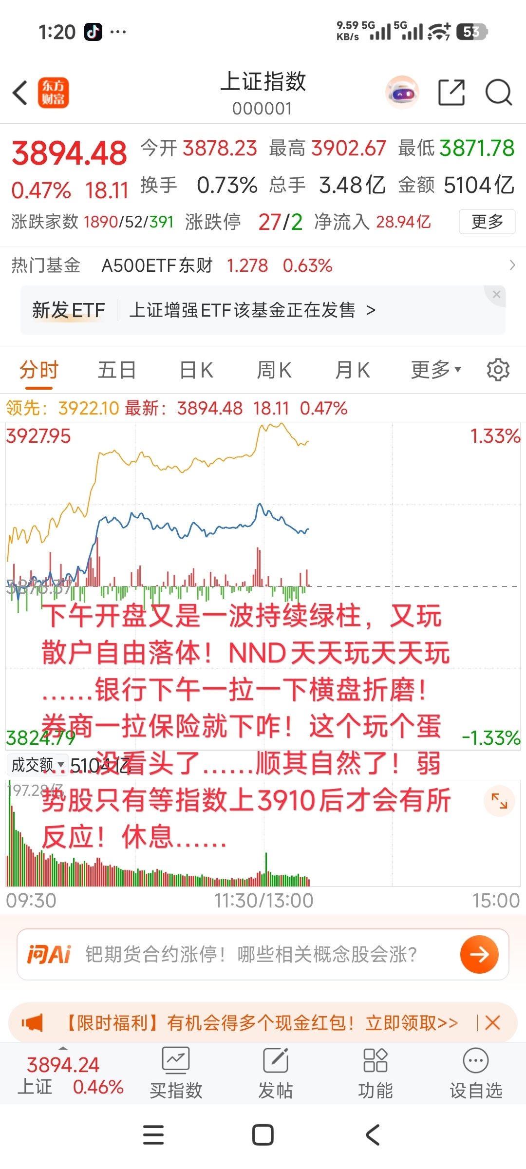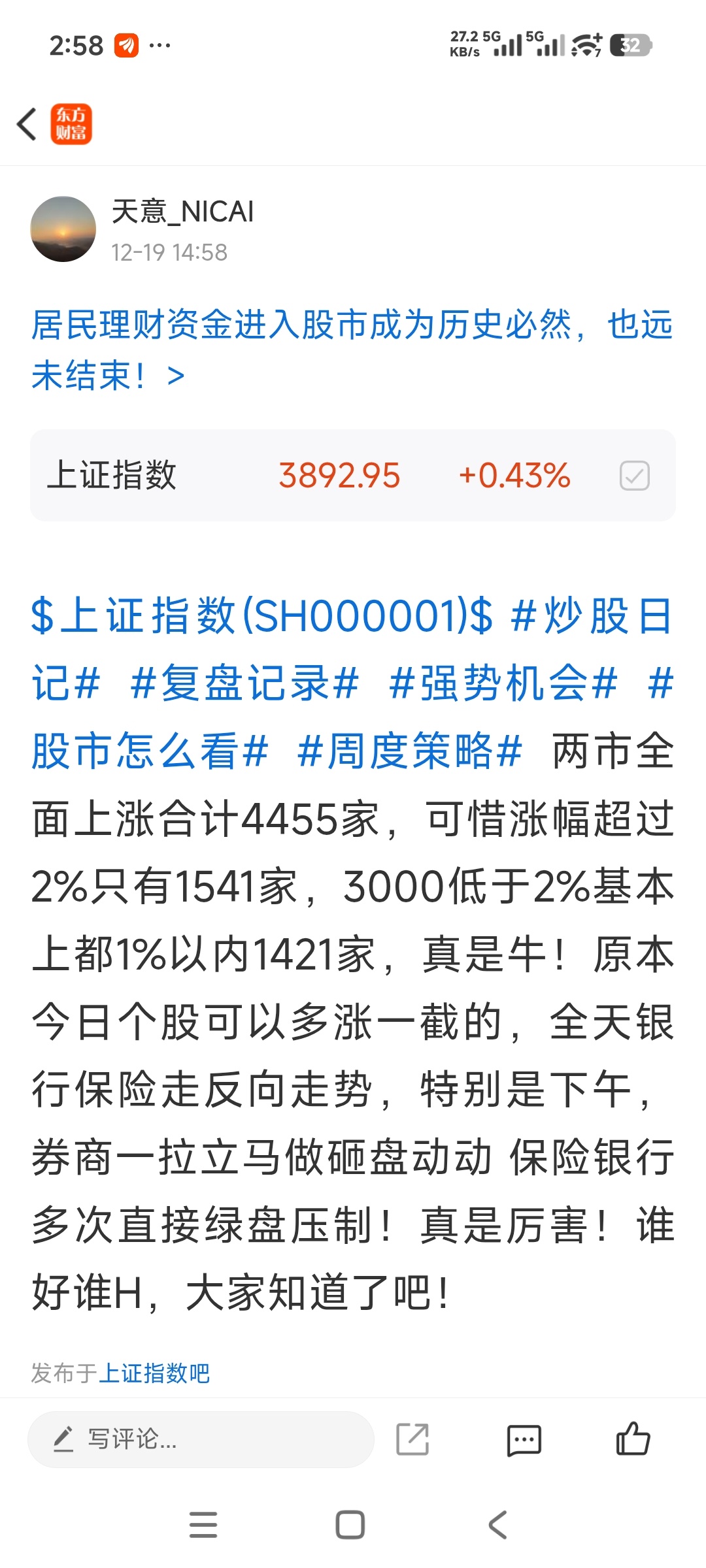 $上证指数(SH000001)$ $东方财富(SZ300059)$ #炒股日记# #复盘记录# #强势机会# #股市怎么看# #周度策略# $深证成指(SZ399001)$ 如何是不是跟说的一模一样!就怕保险+银行下午搞事情,结果还真的!!不是不知道主力要怎么玩,只是没有发改变而已!就这么着了!