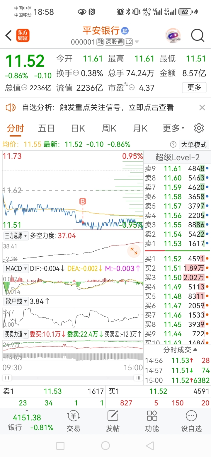 $平安银行(SZ000001)$ 增持银行股,明天指数大概率冲高回落。