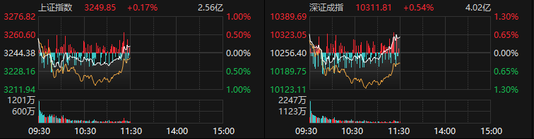 A股三大指数早盘集体上涨,截至午间收盘,沪指涨0.17%,深证成指涨0.54%,创业板指涨0.32%,北证50指数涨0.21%。全市场半日成交额7836亿元,较上个交易日同期缩量130亿元。